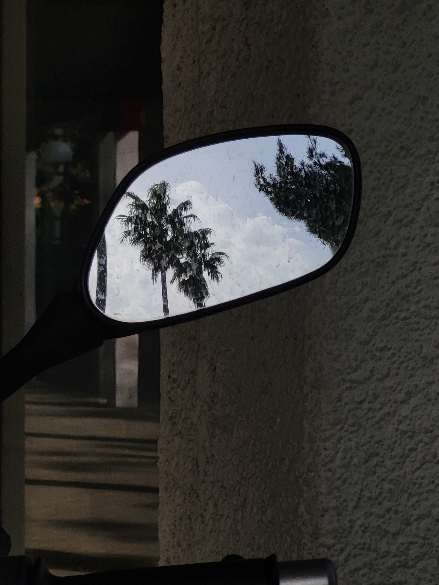 The image shows a motorcycle side mirror reflecting a cloudy sky and palm trees. Raindrops are visible on the mirror's surface. The background behind the mirror reveals part of a building with a textu…read more