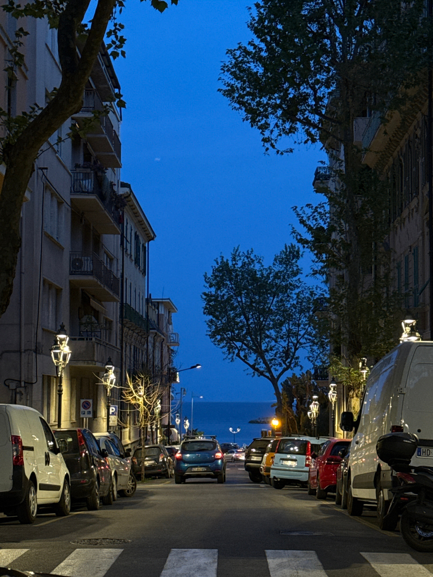 The image depicts a street in Sanremo, Italy, at dusk. Cars are parked along the right side of the street, near a pedestrian crossing. The architecture shows buildings with balconies. Streetlights are…read more