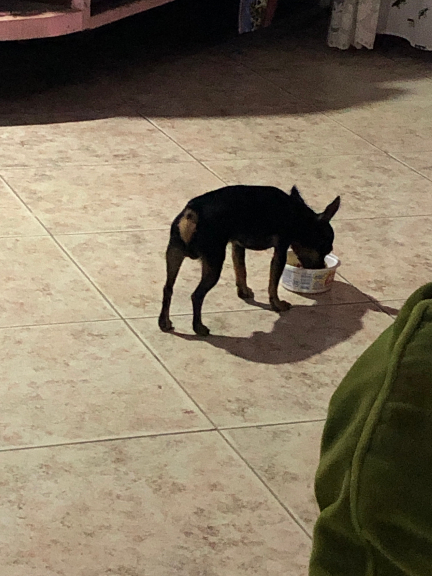 A small, black dog with tan markings is lying on its side on a tiled floor, eating from a white and patterned container. A green, plush cushion sits near the dog on the right side of the frame. A darkβ¦read more