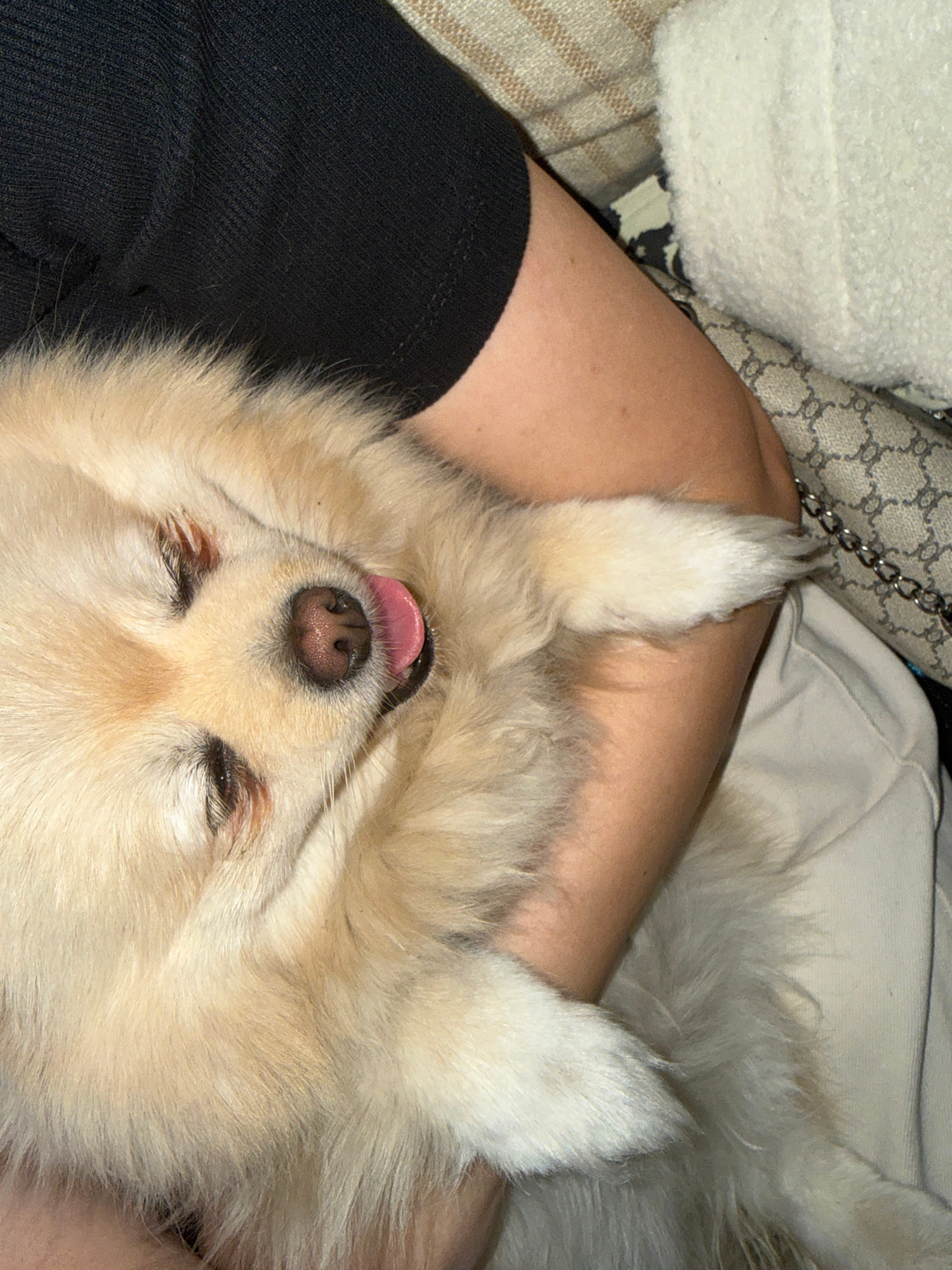 The image shows a small, cream-colored dog, possibly a Pomeranian or similar breed, lying on its back in someone's arms. The dog's eyes are closed, and its tongue is slightly protruding. The person ho…read more