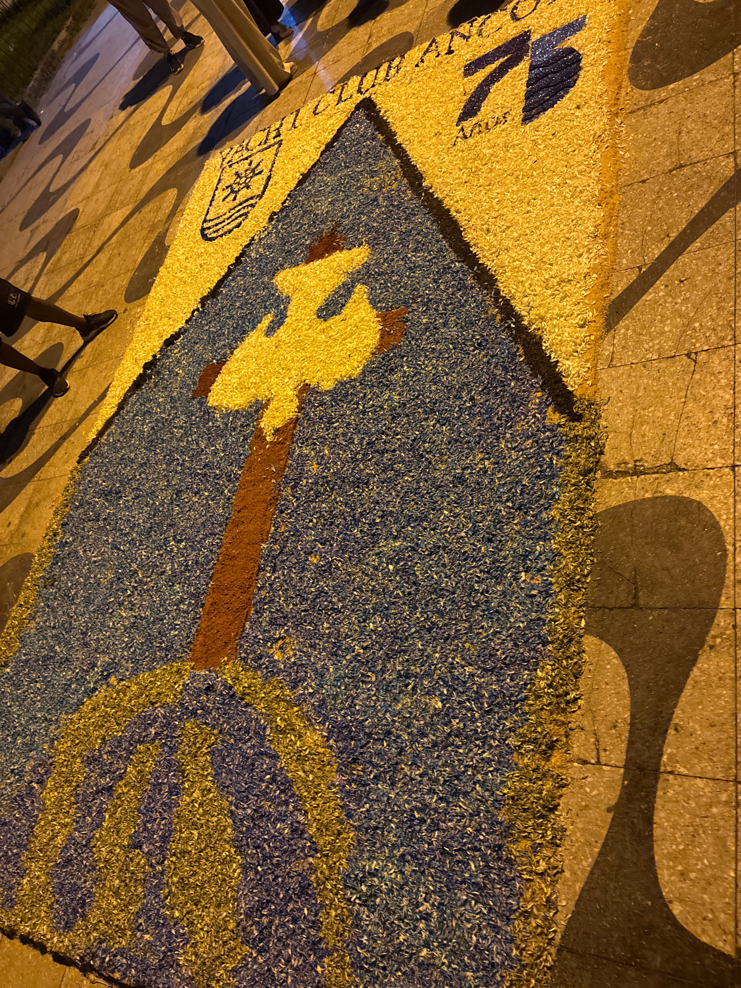 The image shows an ephemeral flower carpet or "alfombra de flores" laid out on a stone tiled sidewalk in Ancón, Peru. The artwork features the image of a fisherman with his net. The main background co…read more