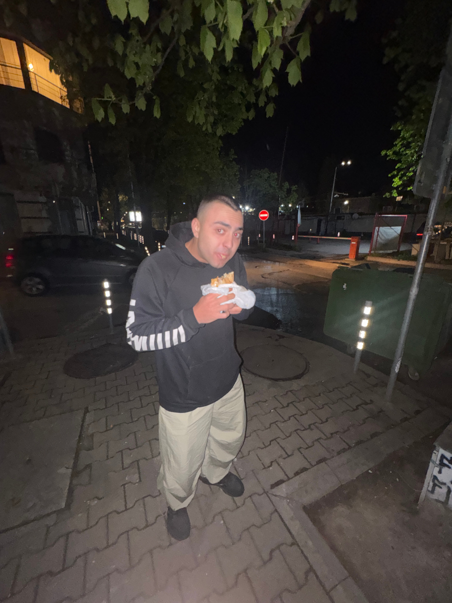 A man stands on a brick sidewalk in Sofia, Bulgaria. He is holding a wrapped sandwich and looking at the camera. He is wearing a black hooded sweatshirt with white stripes on the sleeves and khaki pan…read more