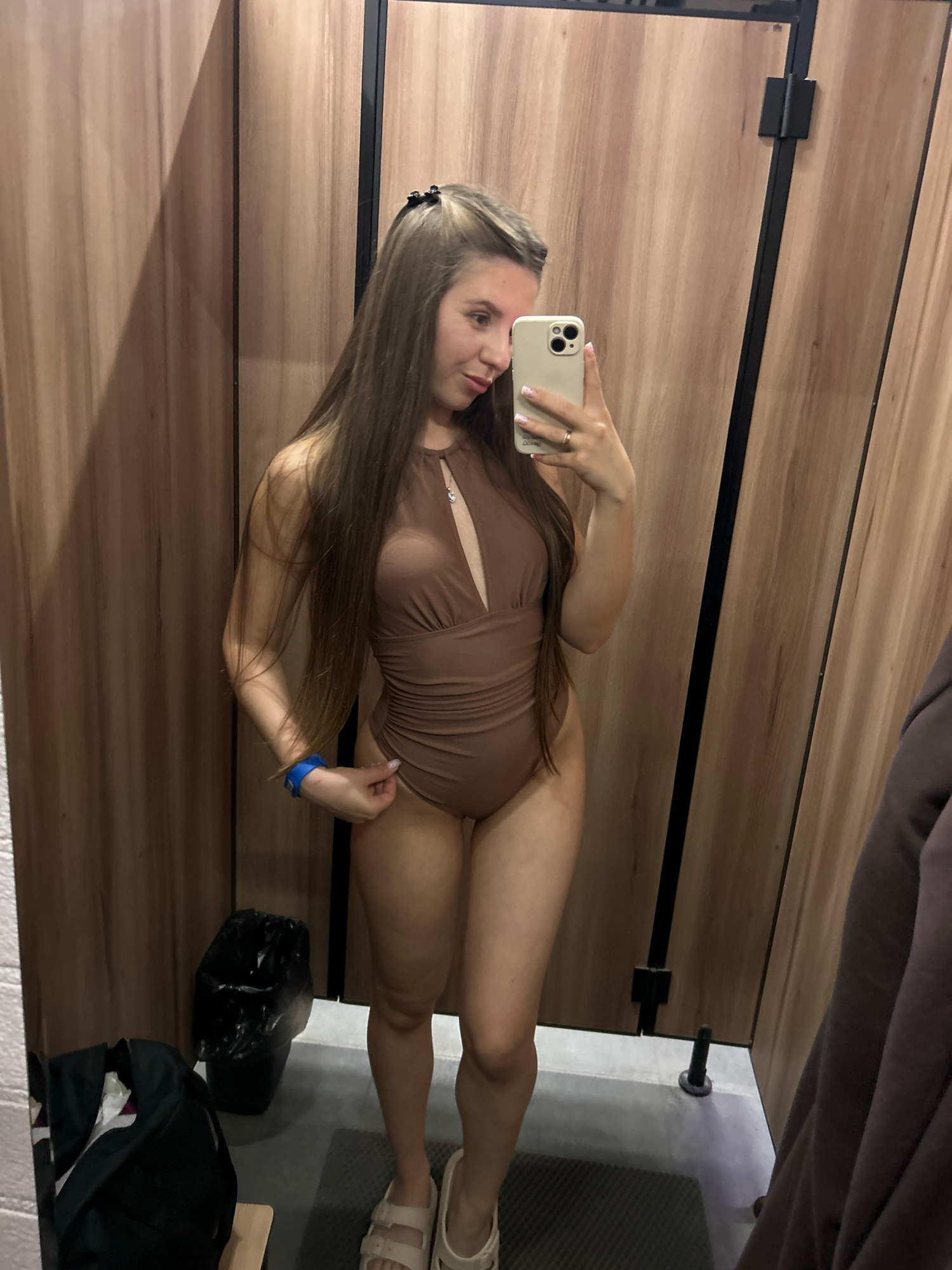 A young woman is captured in a mirror selfie within what appears to be a fitting room or a private changing area. She has long, straight brown hair, with a small black clip holding back some strands.…read more