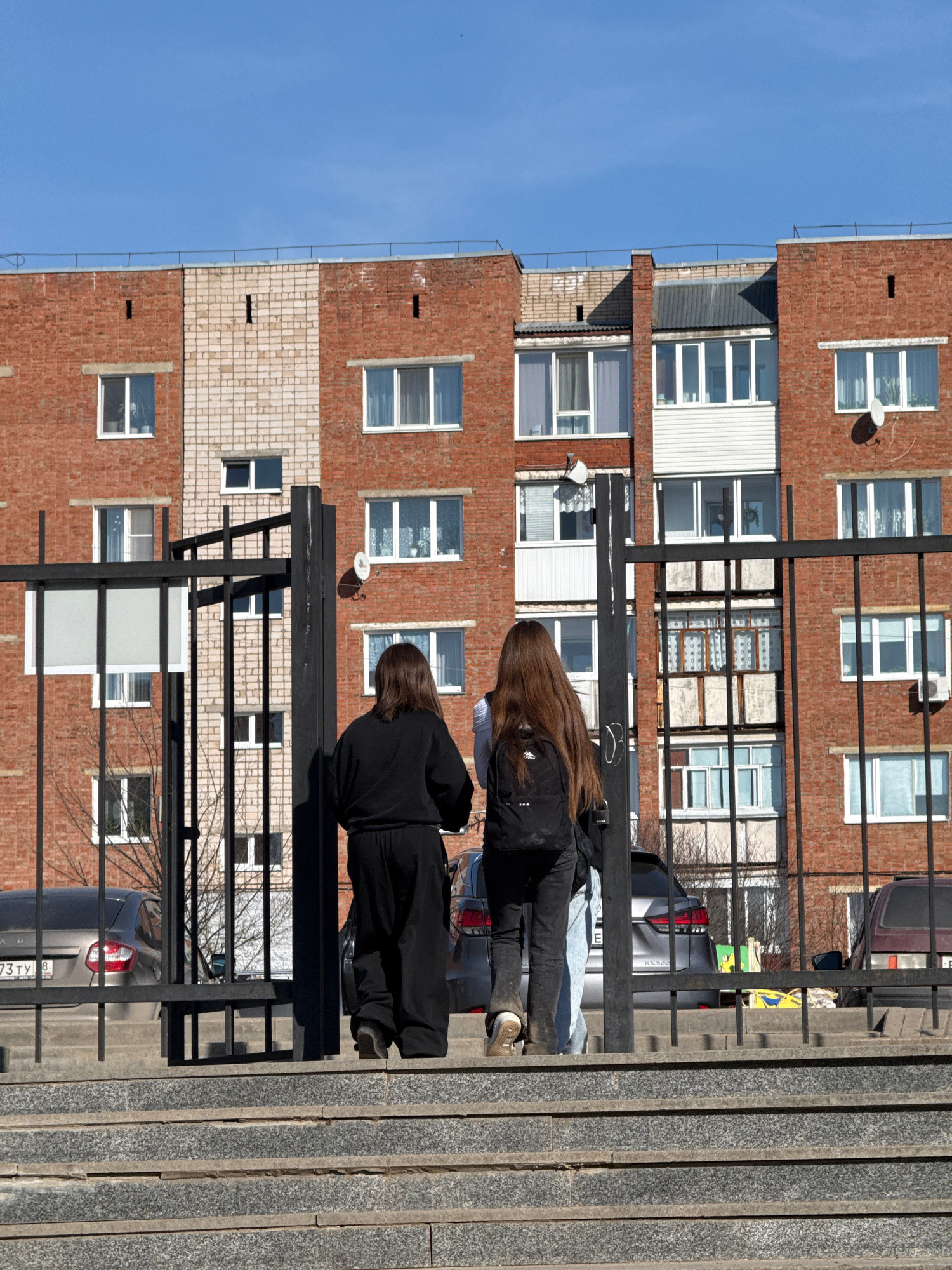 Two people are standing on a sidewalk next to a metal railing in what appears to be an urban setting in Votkinsk, Russia. The person in the foreground is wearing a black outfit. The second person is w…read more