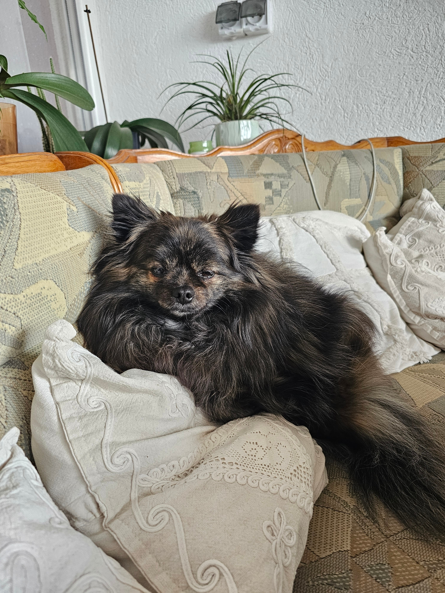 A black and tan long-haired dog lies on a patterned sofa, nestled among three white decorative pillows. The sofa is positioned in a room with a white wall and baseboard visible in the lower left. A pl…read more