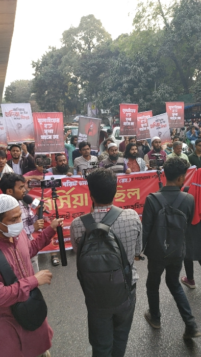 This daytime image depicts a street protest or demonstration in Dhaka, Bangladesh. A dense crowd of predominantly adult males is gathered, many holding red and white banners with Bengali text. One pro…read more