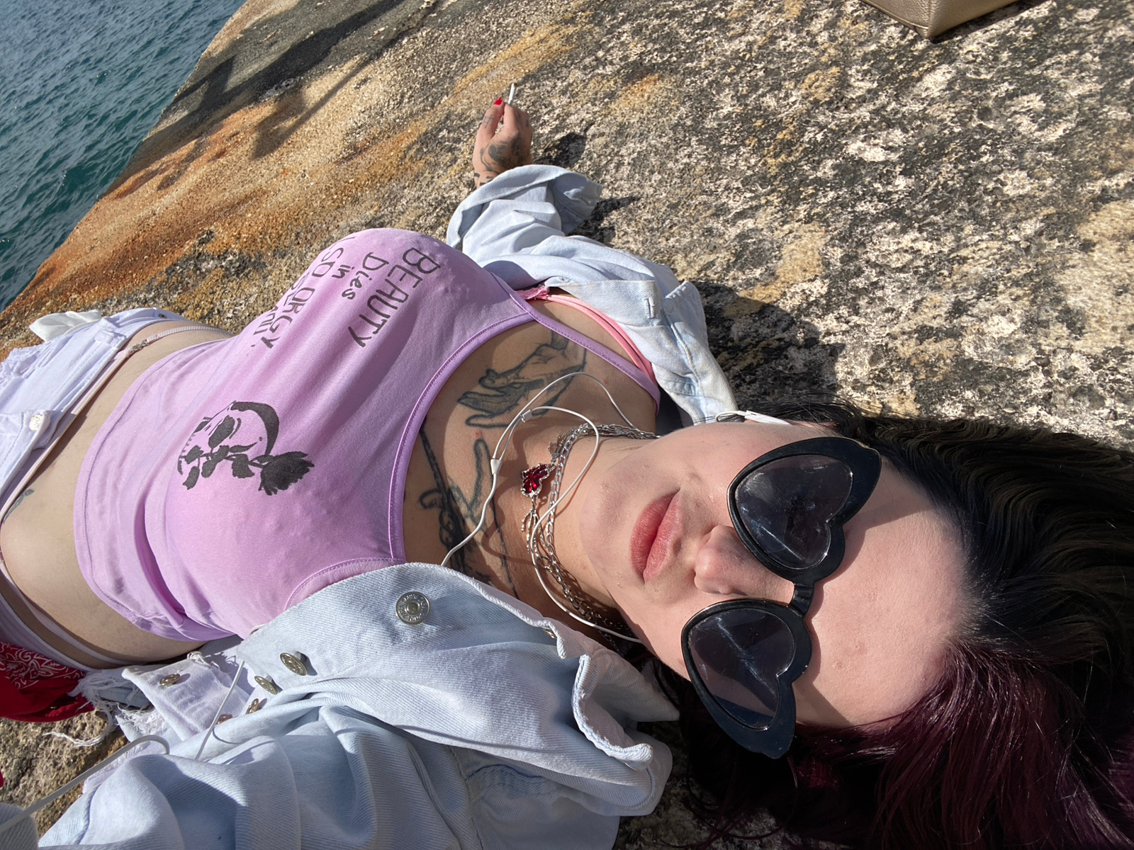 An overhead shot shows a woman lying on a rocky surface with water visible in the lower right corner. She has dark hair with reddish highlights, and is wearing heart-shaped sunglasses. She is dressed…read more