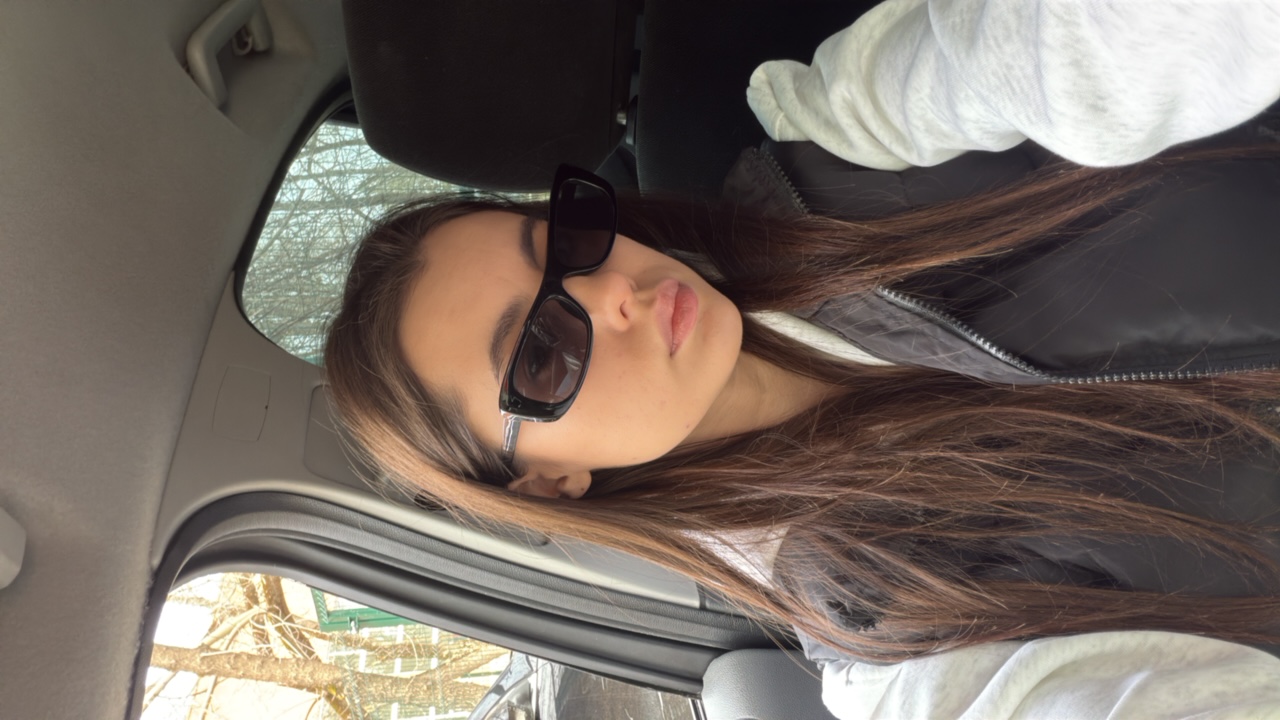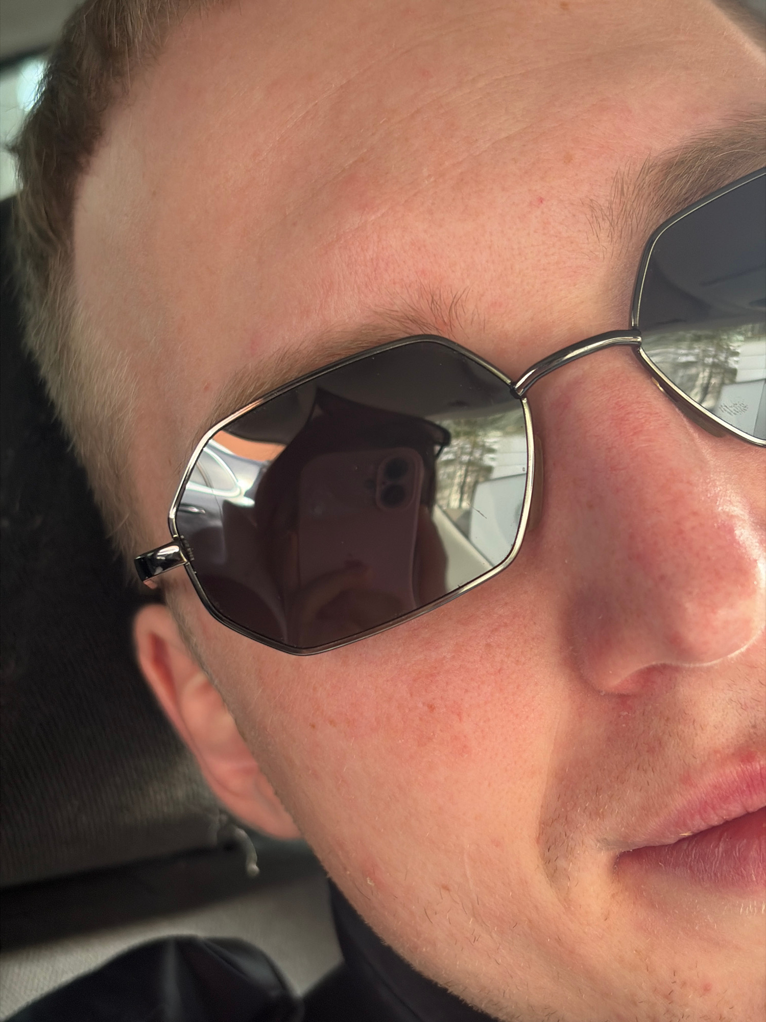 The image shows a close-up of a person's face wearing sunglasses. The reflection in the sunglasses reveals a pink phone. The person's skin is fair, and the image angle is slightly rotated. The locatio…read more