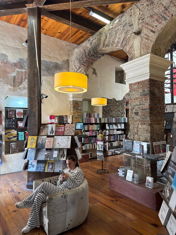 The image depicts the interior of Profética, Casa de la Lectura, a bookstore located in the historic center of Puebla, Puebla, Mexico. The environment features a rustic aesthetic with exposed wooden c…read more