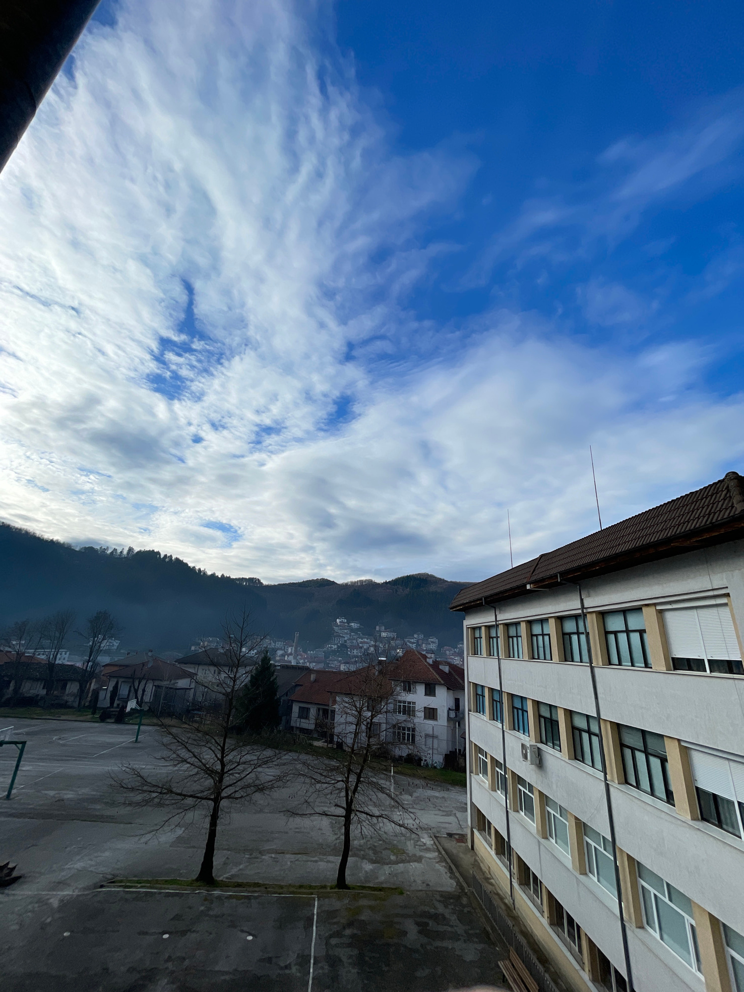 The photograph, taken from an elevated position in Zlatograd, Bulgaria, depicts a partially overcast sky above a mountainside populated with buildings, a multi-story building on the right side of the…read more