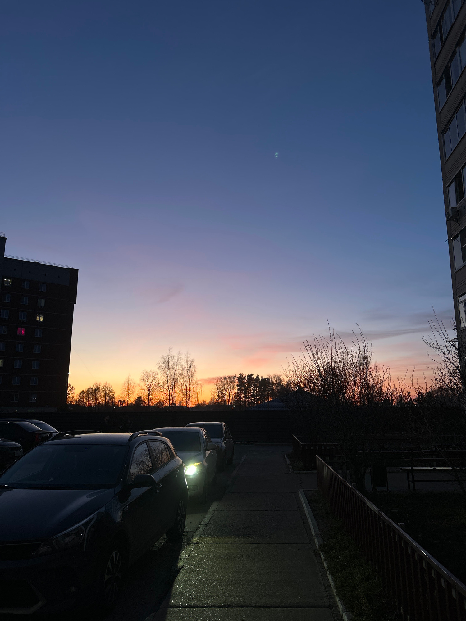 The image captures a serene urban scene at sunset or dusk in Chaikovsky, Russia. The sky, dominating the upper portion, displays a beautiful gradient of colors, transitioning from a deep indigo blue i…read more