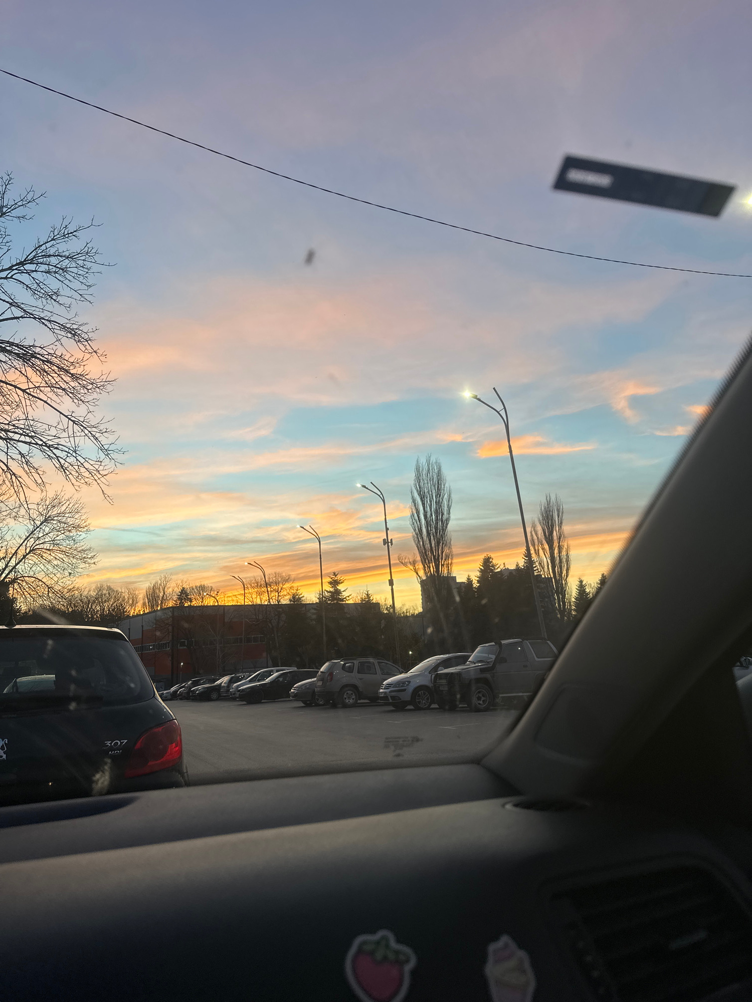 The image appears to have been taken from inside a vehicle, looking out towards a parking lot adjacent to a road. A row of parked cars is visible, alongside streetlights that are on. The sky is exhibi…read more