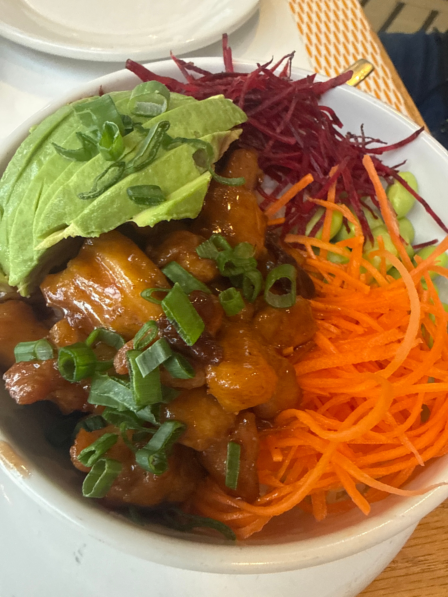 The image shows a bowl of food. The food consists of shredded carrots, edamame, shredded beets, avocado slices, and what appears to be chicken in a glaze, garnished with chopped green onions. It is un…read more