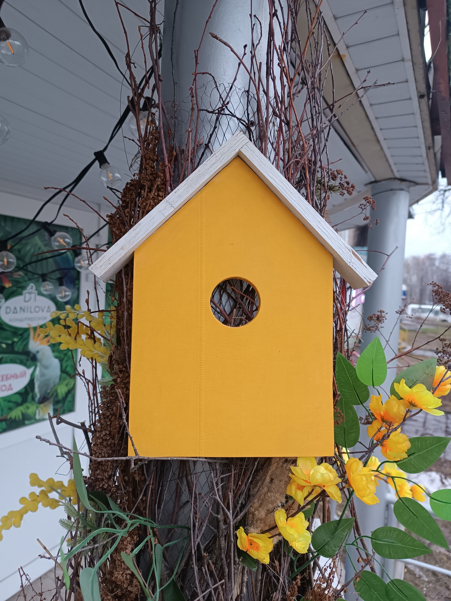 A yellow birdhouse with a white roof is mounted on a gray metal pole, surrounded by dried branches and artificial yellow flowers with green leaves. The birdhouse has a round opening. In the background…read more