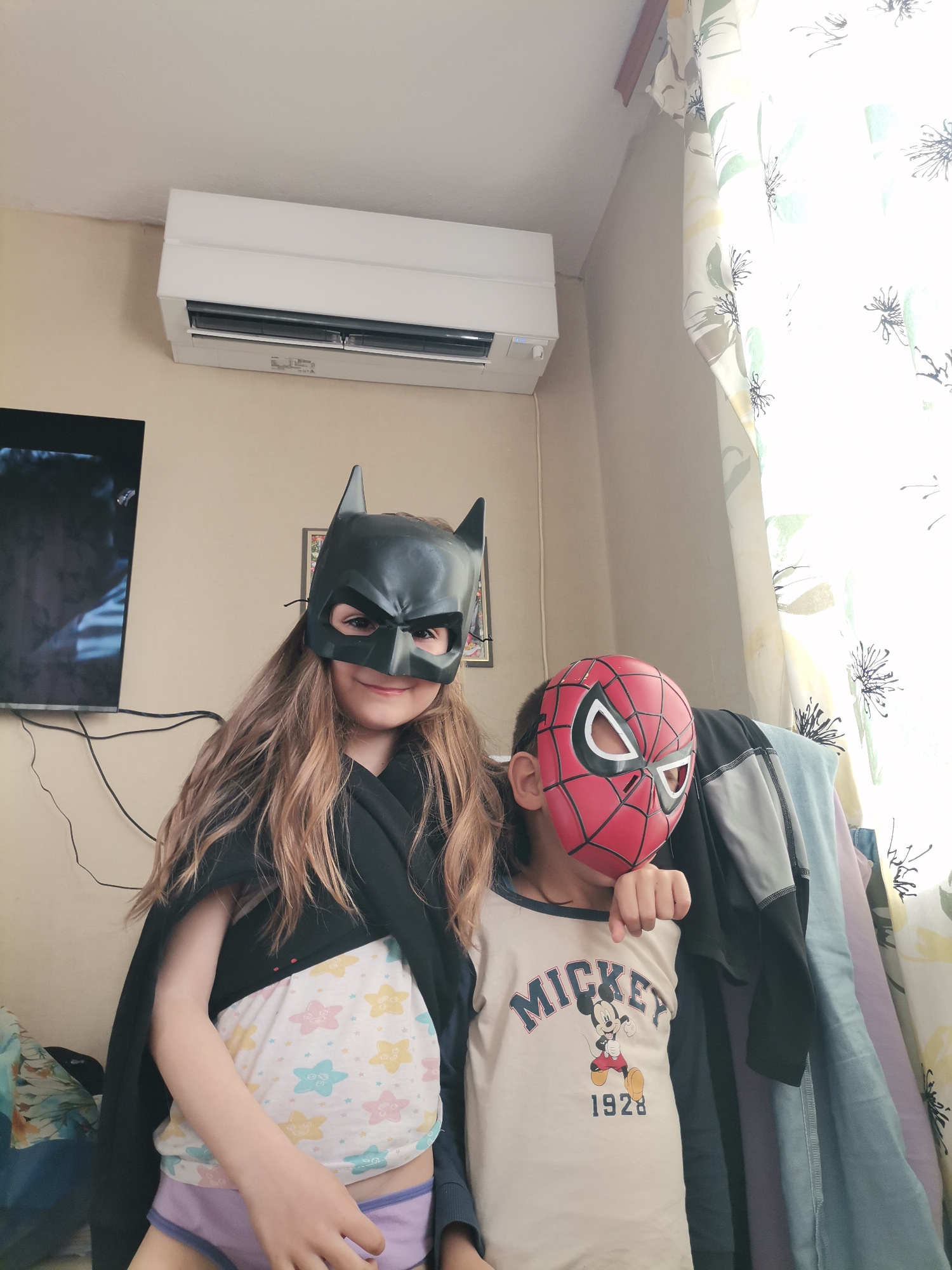 Two children are posing for a photo indoors. The child on the left wears a Batman mask, a black cape, and printed underpants with a purple trim. The child on the right wears a Spiderman mask and a lon…read more