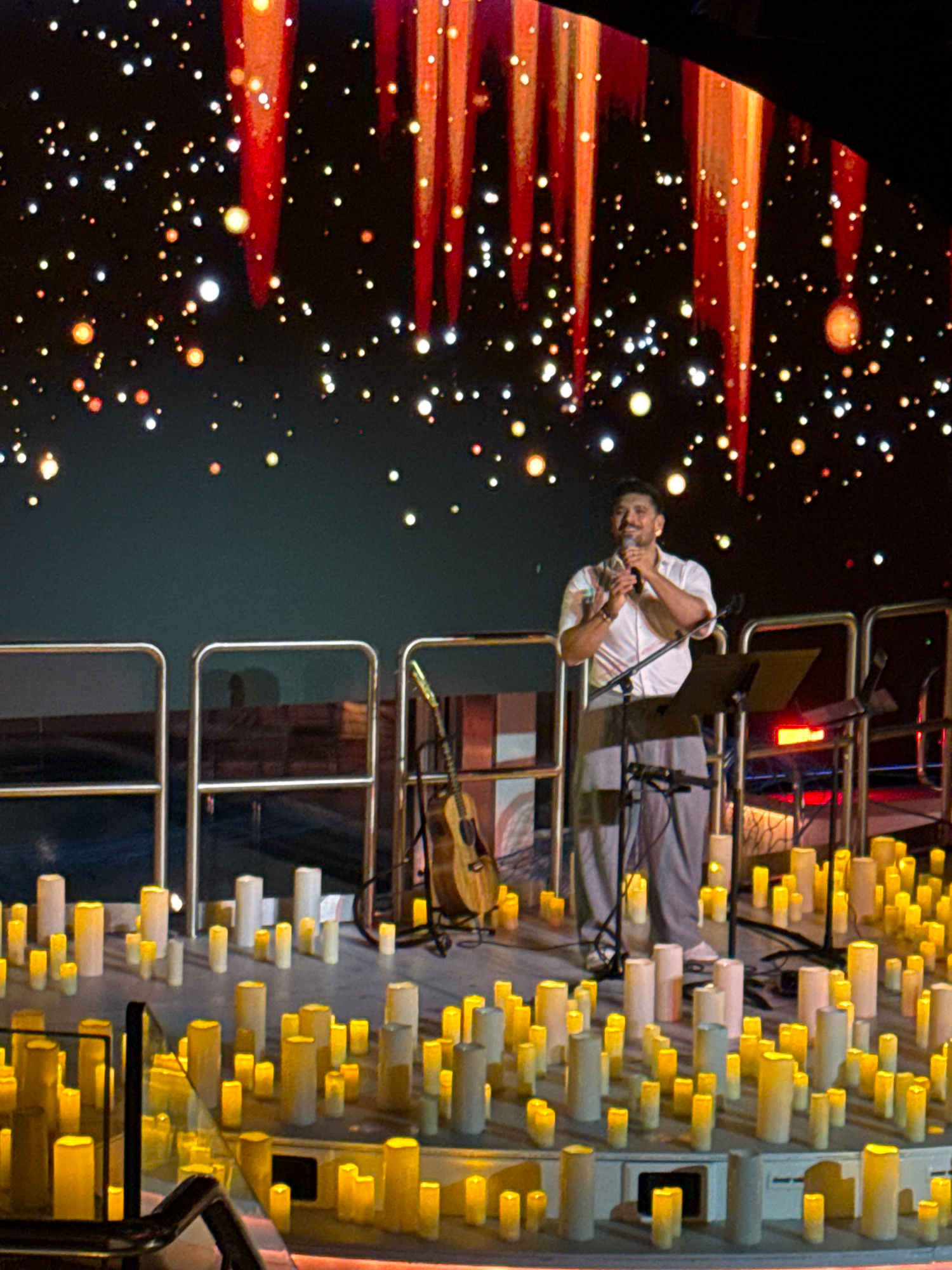 Here is a description of the image: The image shows a man singing on stage, holding a microphone in his right hand. He's wearing a short-sleeved white shirt. Behind him is a structure made of metal p…read more