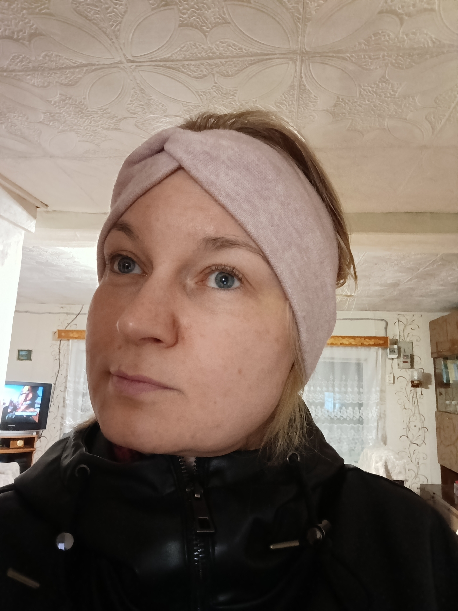 A middle-aged Caucasian woman with blue eyes is seen in a close-up shot. She is wearing a light pink headband that covers part of her blonde hair. She is wearing a black leather jacket with a zipper.β¦read more