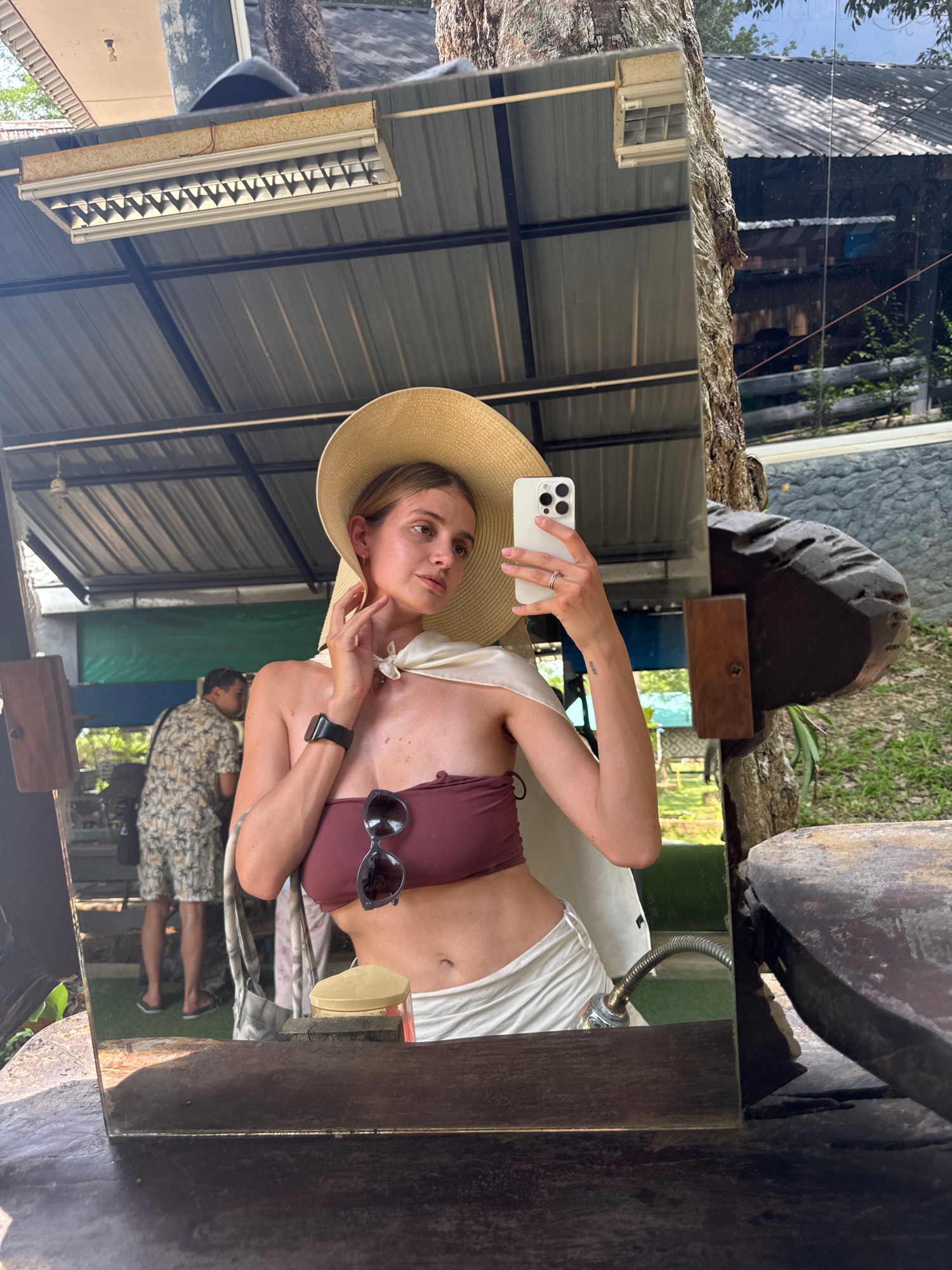 A woman wearing a large straw hat, a maroon bikini top, and a white cover-up is taking a selfie in a mirror outdoors. Sunglasses rest on her bikini top, and she wears a watch on her left wrist. She ho…read more