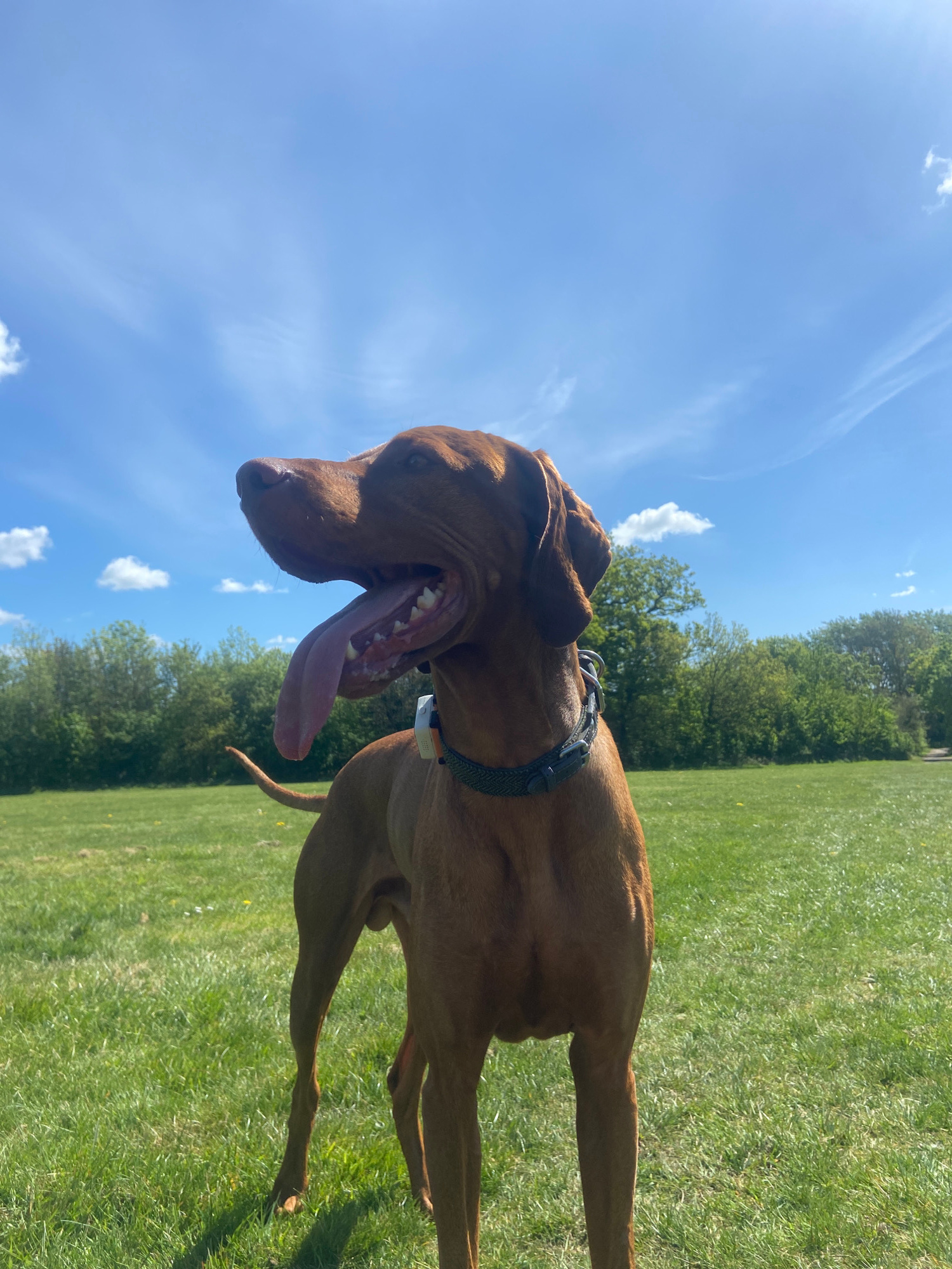 A Vizsla dog with a long pink tongue is panting in a grassy field. The dog is wearing a collar. The sky is blue with scattered white clouds. Trees are visible in the background. The location cannot be…read more