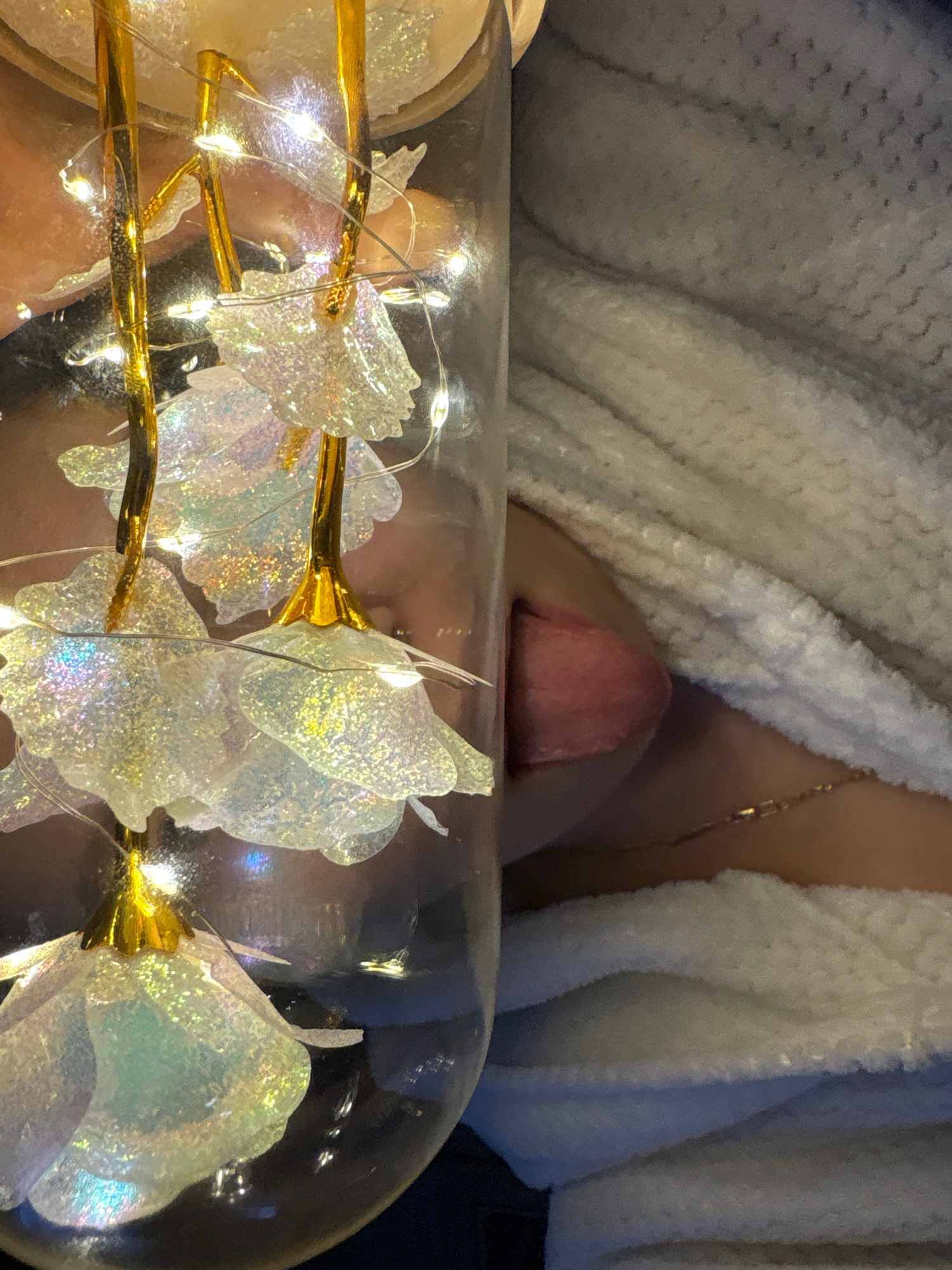 A close-up, low-angle shot focuses on an illuminated artificial floral arrangement encased within a clear, rounded container. The flowers appear to be a pale, iridescent white, adorned with gold stems…read more