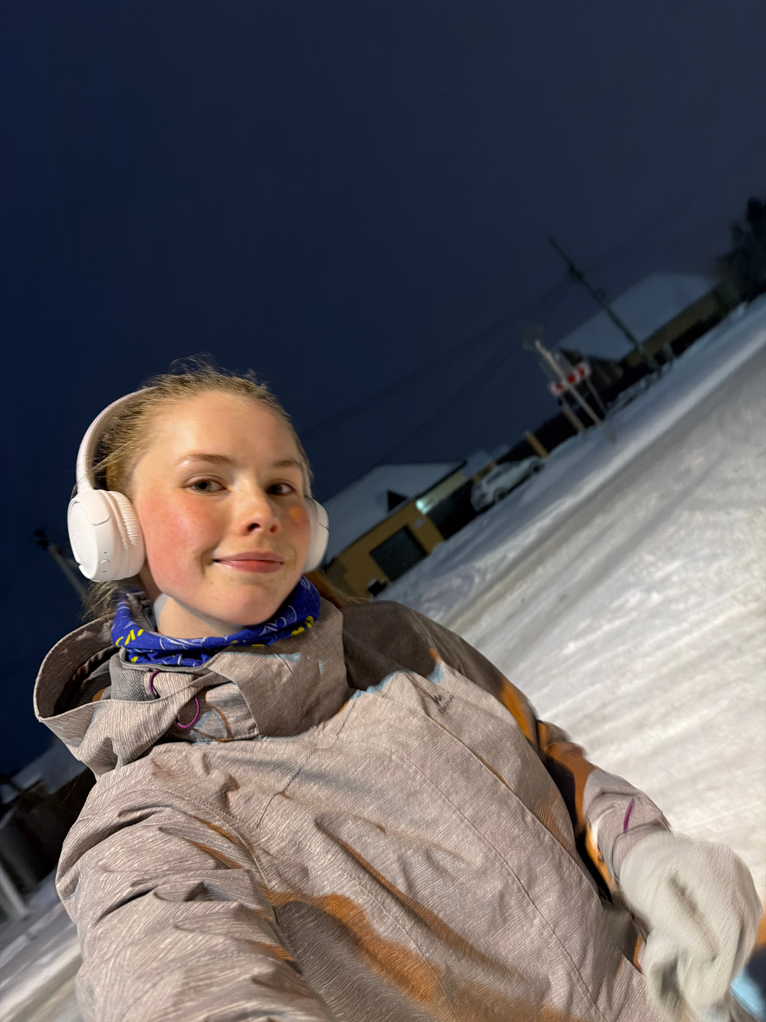 A young woman is centered in the frame, wearing white headphones and a gray jacket. She is looking at the camera with a slight smile. Her cheeks are flushed. A blue patterned scarf is visible around h…read more