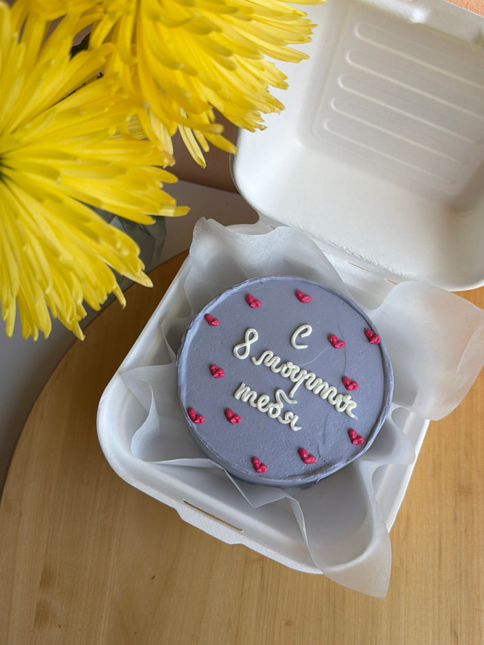 A small, circular cake, frosted gray and adorned with white piped Cyrillic text reading "С 8 марта тебя" (Happy March 8th to you), is presented within an open white disposable container. Scattered acr…read more