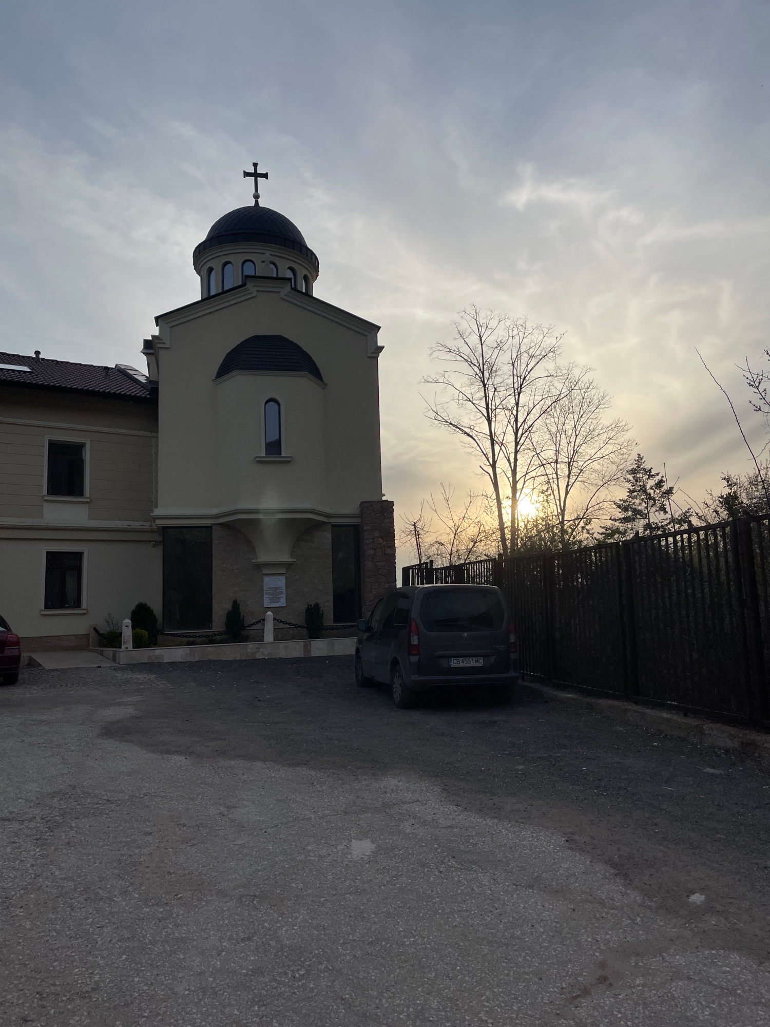 The image depicts a light-colored church building with a dark dome and a cross on top. The church is located next to a paved road, and a dark-colored van is parked on the side. A fence runs along the…read more