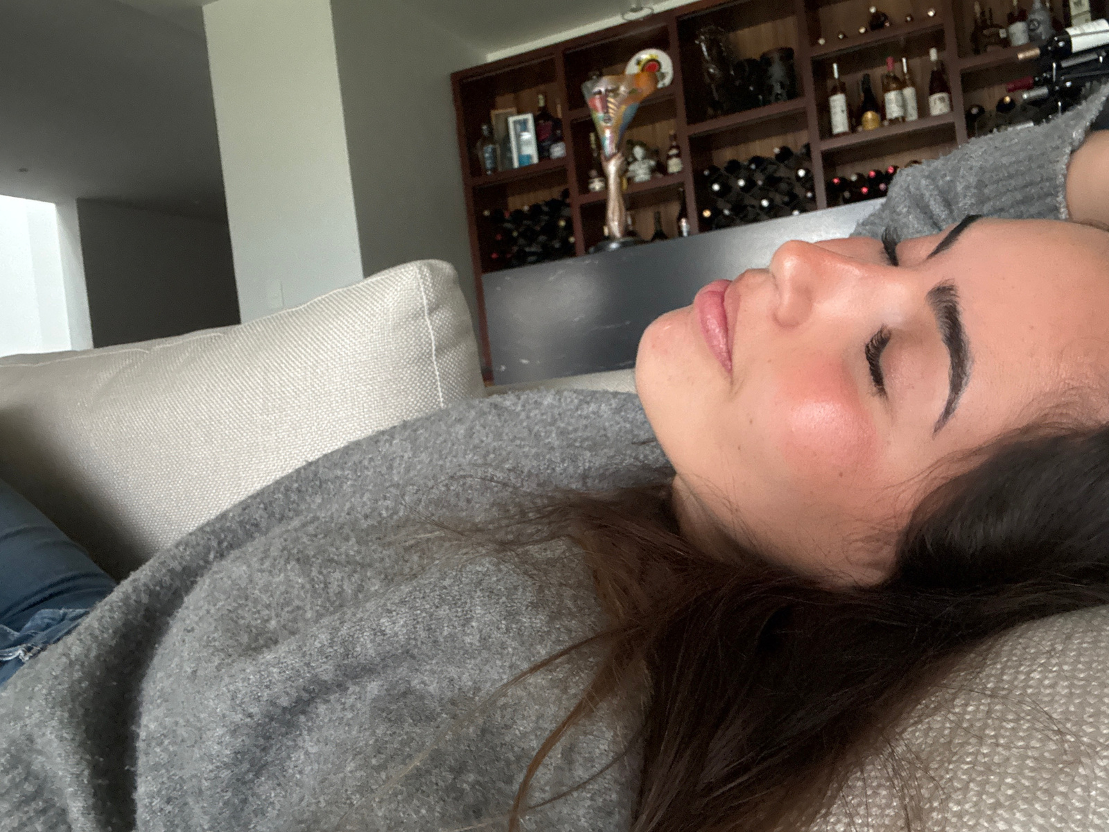 A woman is lying on a light-colored couch, with her head near a dark brown shelf unit that contains various bottles, some appearing to be wine. She has dark hair and is wearing a gray sweater. Part ofโฆread more
