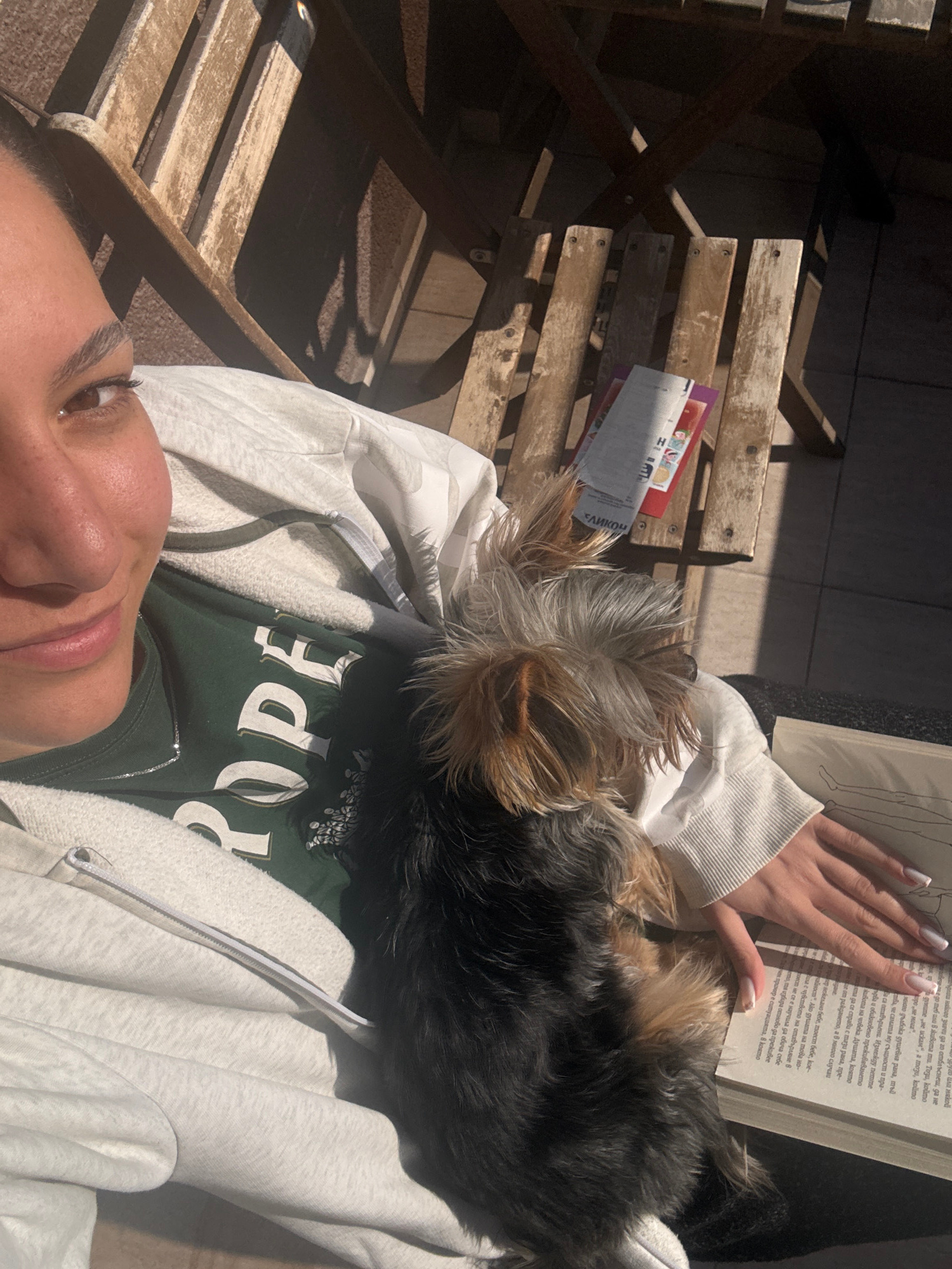A woman is lying on her back outdoors, possibly on a lounge chair or similar seating arrangement. A small dog with brown and black fur is lying on her chest. She is holding an open book in her hand, w…read more