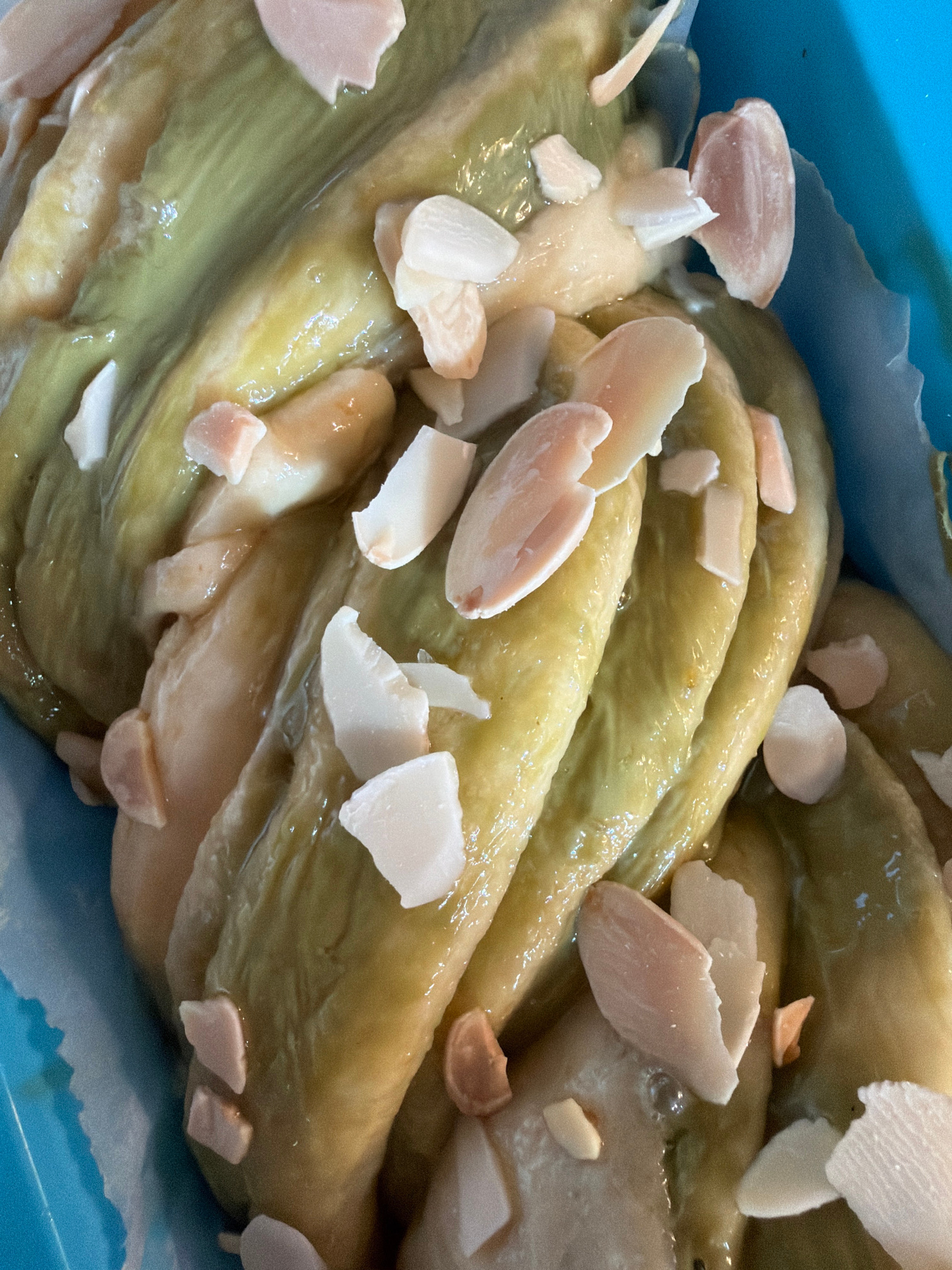 A close-up, high-angle shot displays a green-hued, glossy braided loaf or pastry, likely a dessert. The loaf is arranged in layers or strands, with what appear to be sliced almonds sprinkled on top. T…read more