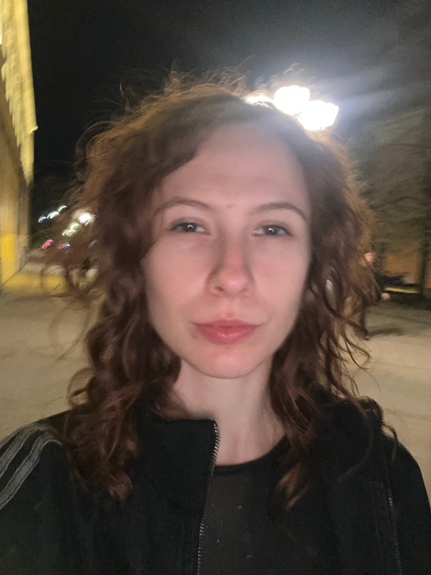 A close-up selfie portrait of a young woman with auburn curly hair, fair skin, and green eyes. She has a slight smile. She is wearing a black jacket. The background is dark, likely night. Bright light…read more