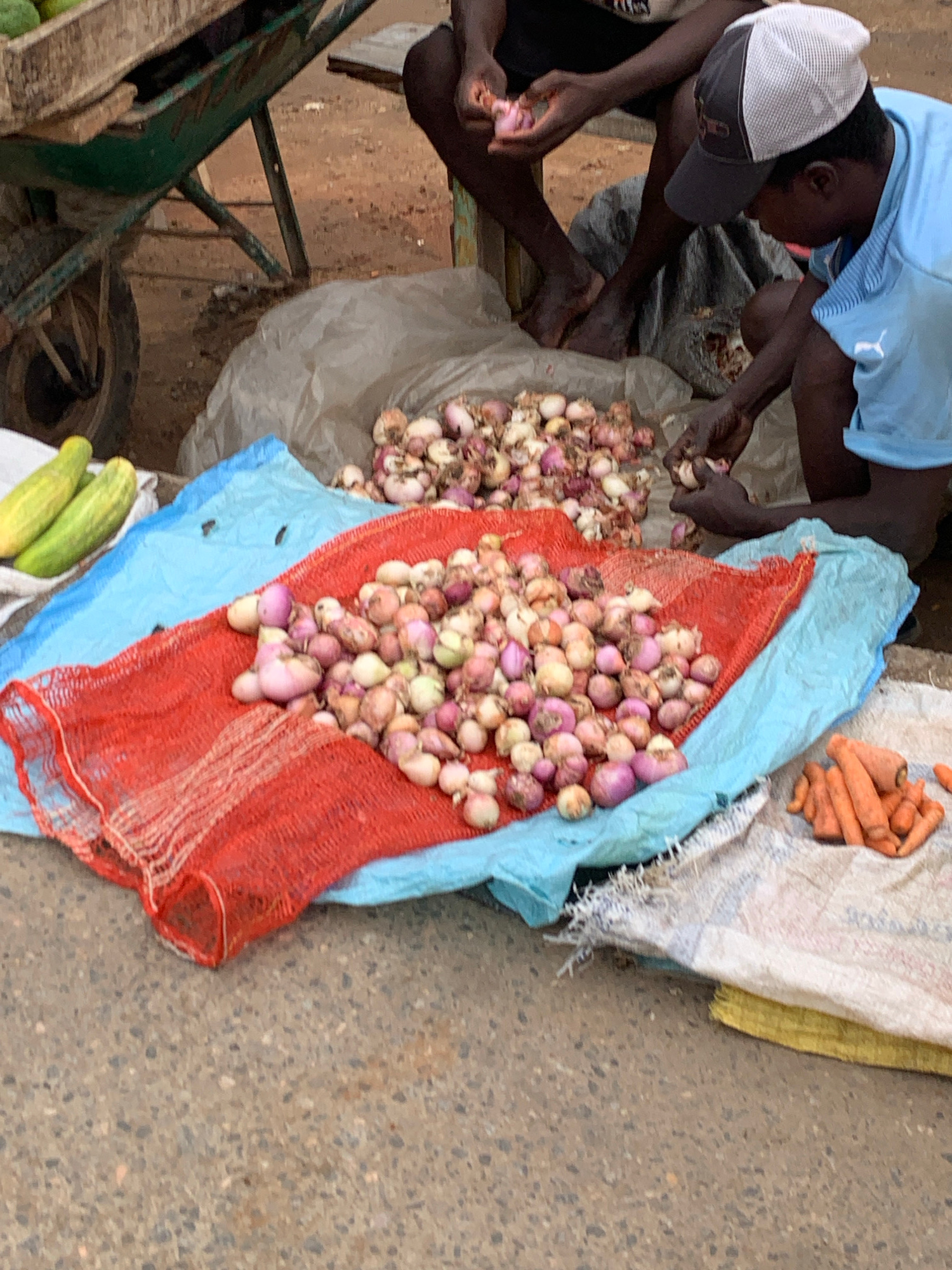 Two individuals are seated on the ground in an open space that appears to be a street or market area in Ikorodu, Nigeria. The persons are handling what seem to be small onions. The onions are in groupβ¦read more