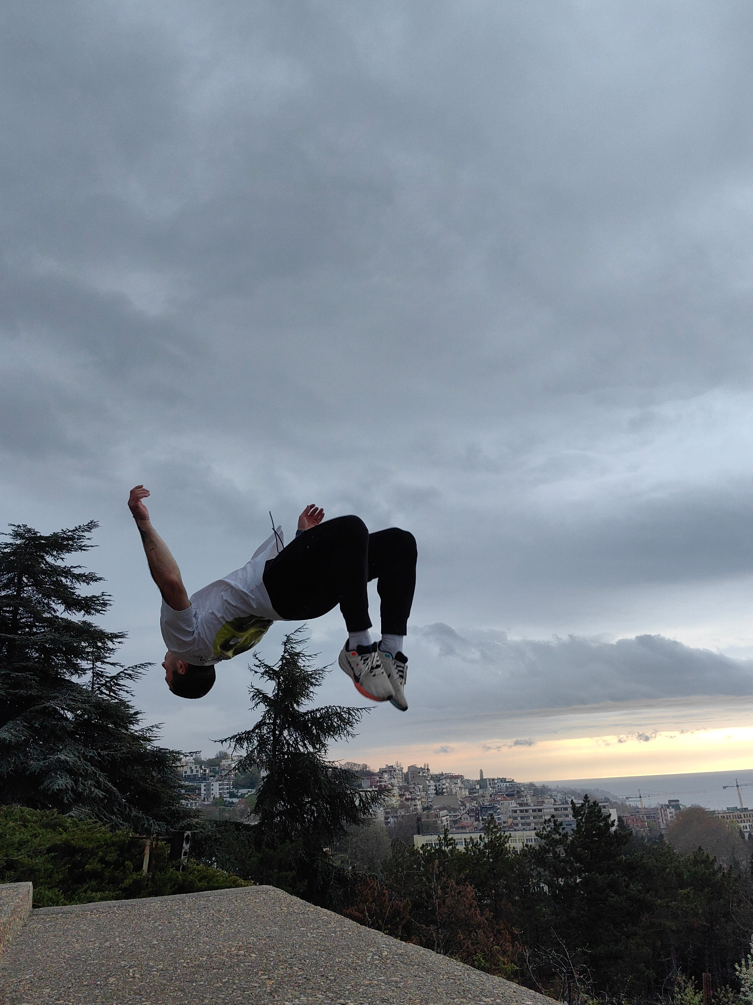 A man is performing a backflip in front of a cityscape. He is wearing a white t-shirt, black pants, and sneakers. The city is identified as Varna, Bulgaria, as indicated by the buildings and the preseβ¦read more