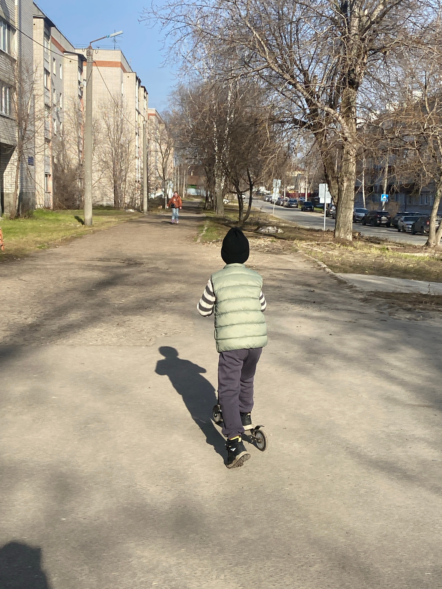 A person is lying on a skateboard on a sidewalk in Kazan, Russia. The person is wearing a black beanie, a light green puffer vest with a striped shirt underneath, and gray pants with black shoes. Theβ¦read more
