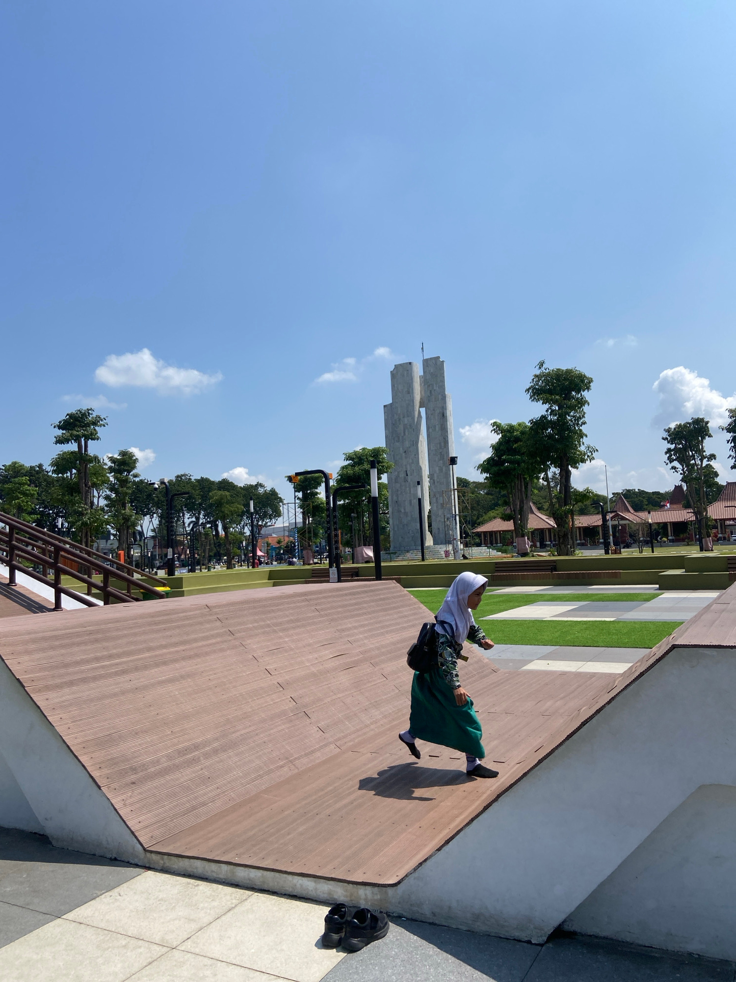 A young person wearing a white headscarf, a white top, and a long green skirt is sitting on a wooden structure on a sunny day. The individual appears to be using a mobile device. The location is Sidoa…read more