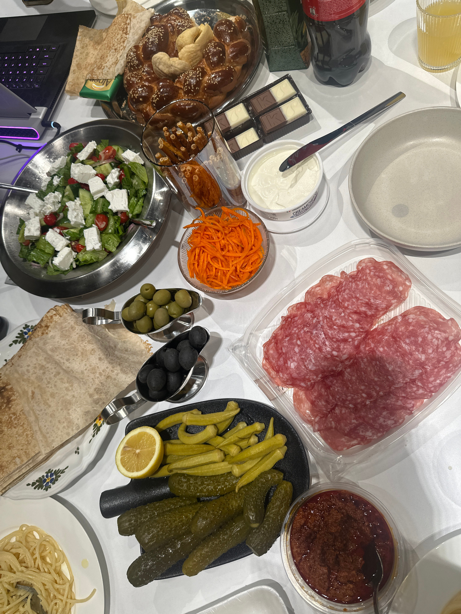 The image captures a well-lit, top-down view of a food-laden table. The scene appears to be indoors, with a white surface serving as the backdrop. On the table, there is an assortment of food items,…read more