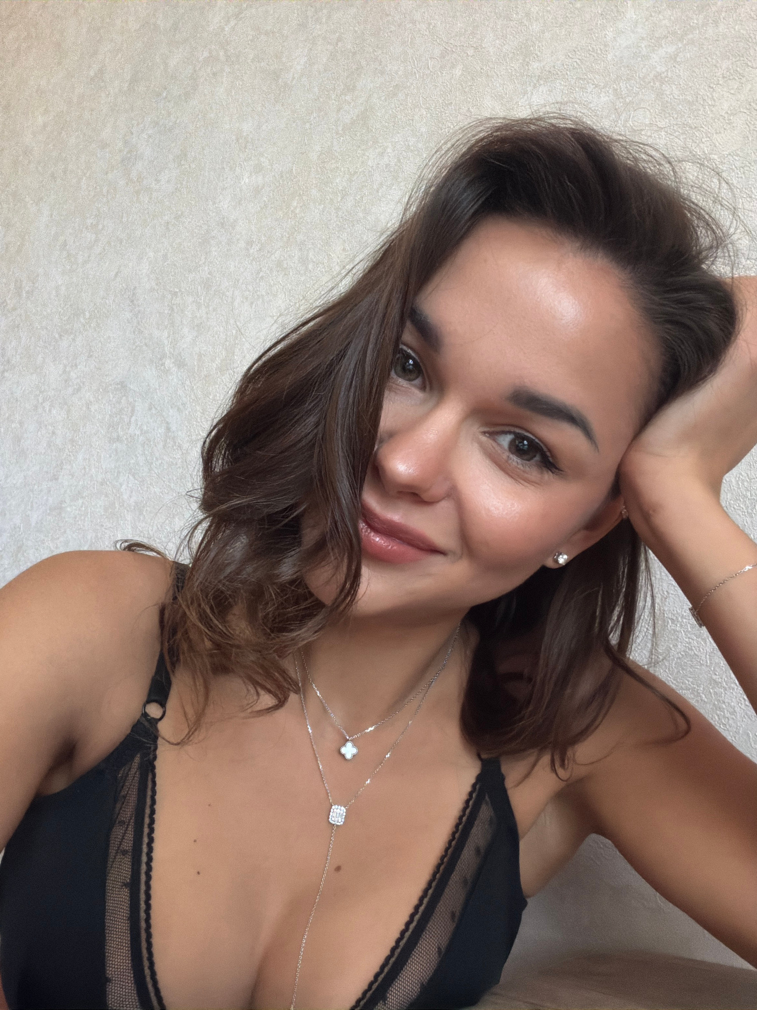 A medium shot of a woman with brown hair and light brown eyes smiling at the camera. She is wearing a black bra with lace detailing and two silver necklaces, one with a clover pendant and another with…read more
