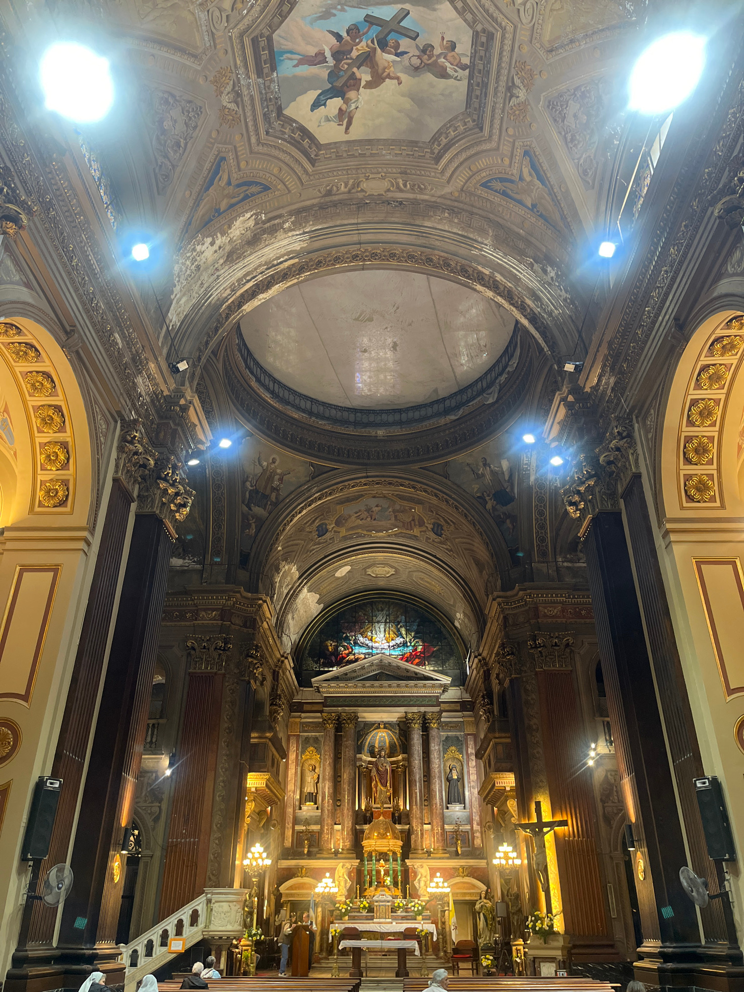 View inside the Catedral Metropolitana de Buenos Aires, Argentina, showing the ceiling and altar. The ceiling is adorned with paintings, gold leaf, and architectural details. The altar is decorated wi…read more