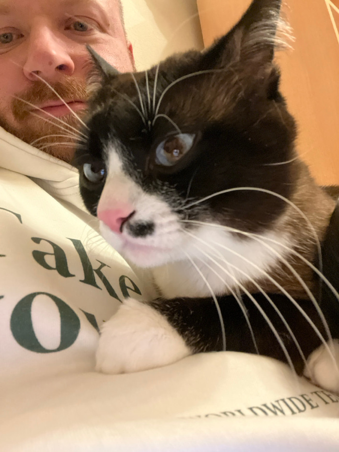 A cat with black and white fur, blue eyes, and long white whiskers peers down at the viewer with curiosity. It's resting on a white fabric with green lettering. In the bottom left corner, a portion ofโฆread more