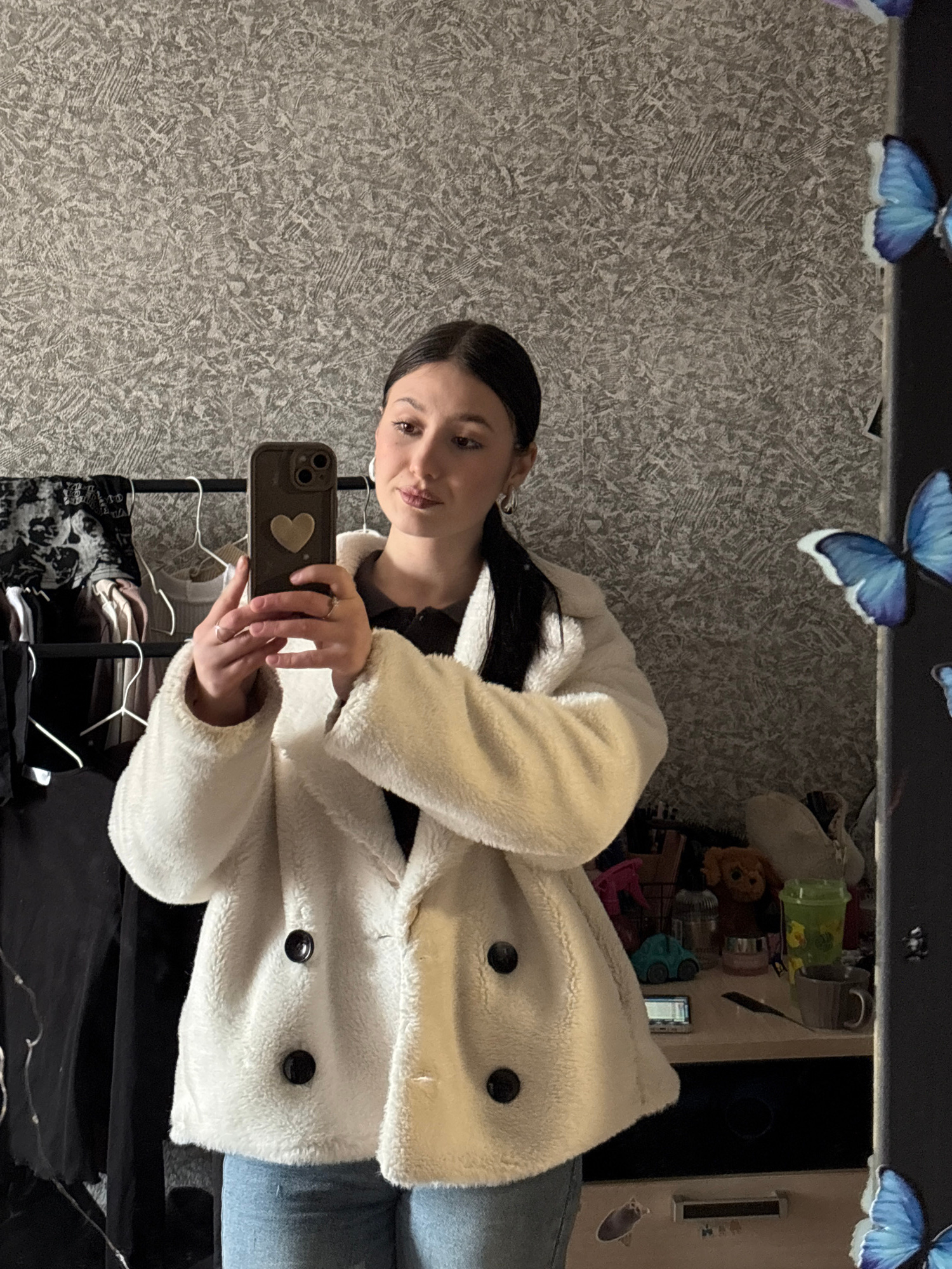 A woman is taking a selfie in front of a mirror. She is wearing a white, furry coat with black buttons and holding a smartphone with a heart-shaped sticker on the back. Behind her, the mirror reflects…read more