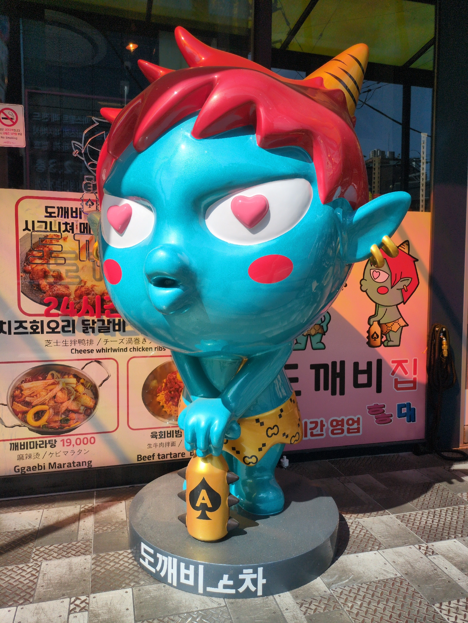 A brightly-colored statue of a blue demon with red hair and a yellow horn stands in front of a restaurant in Seoul, South Korea. The demon has heart-shaped pupils and is holding a spiked club with a b…read more