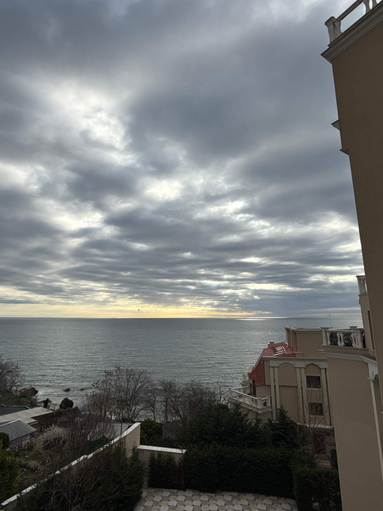 The image captures a view of the Black Sea from what appears to be a high-rise building or cliffside property in Varna, Bulgaria. The sea is visible in the center of the frame, with the coastline exte…read more