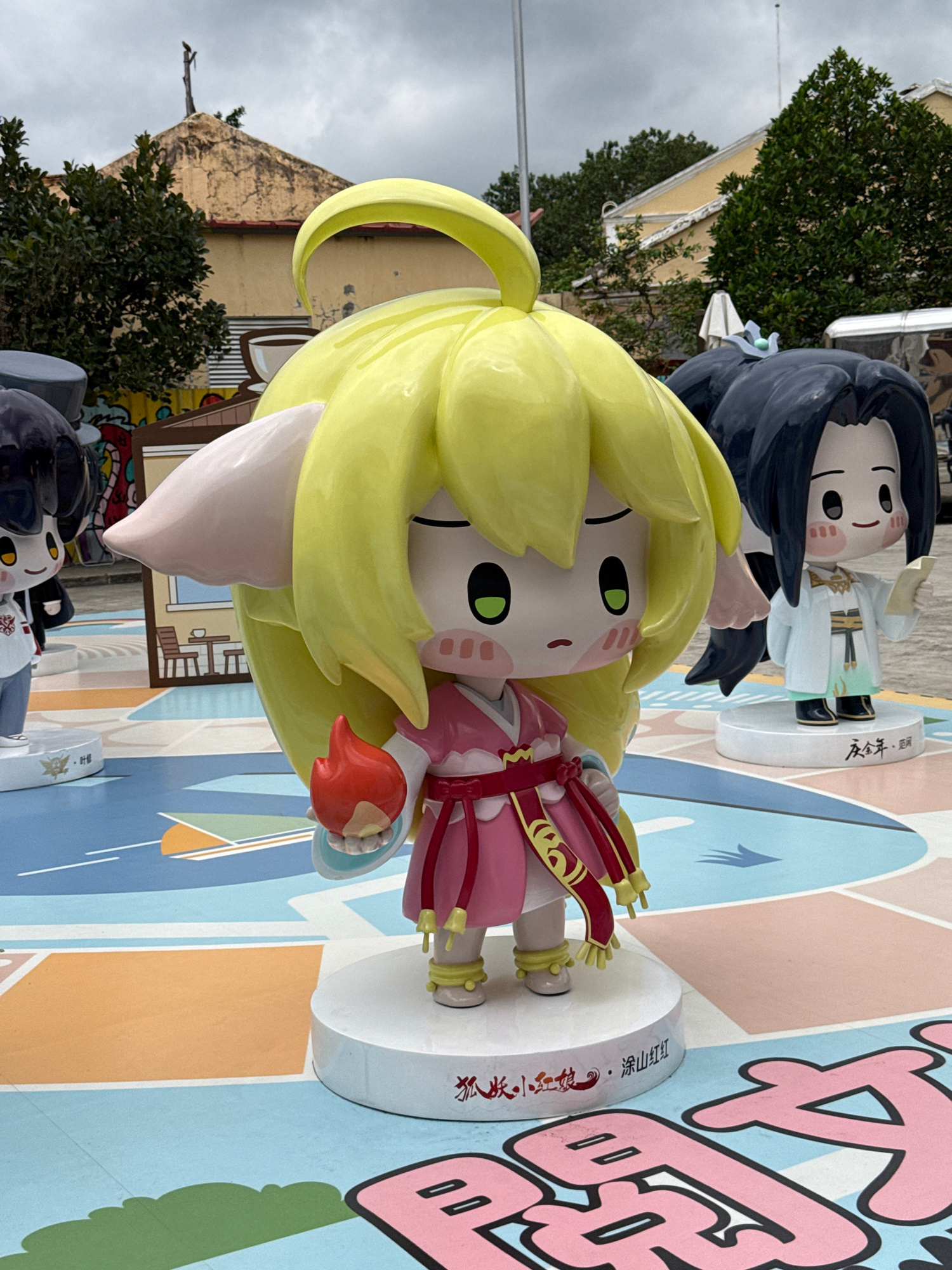 The image captures a scene in Macau, China, featuring large cartoon-style statues placed outdoors. The primary statue, in the foreground, depicts a character with bright yellow, voluminous hair, a pin…read more