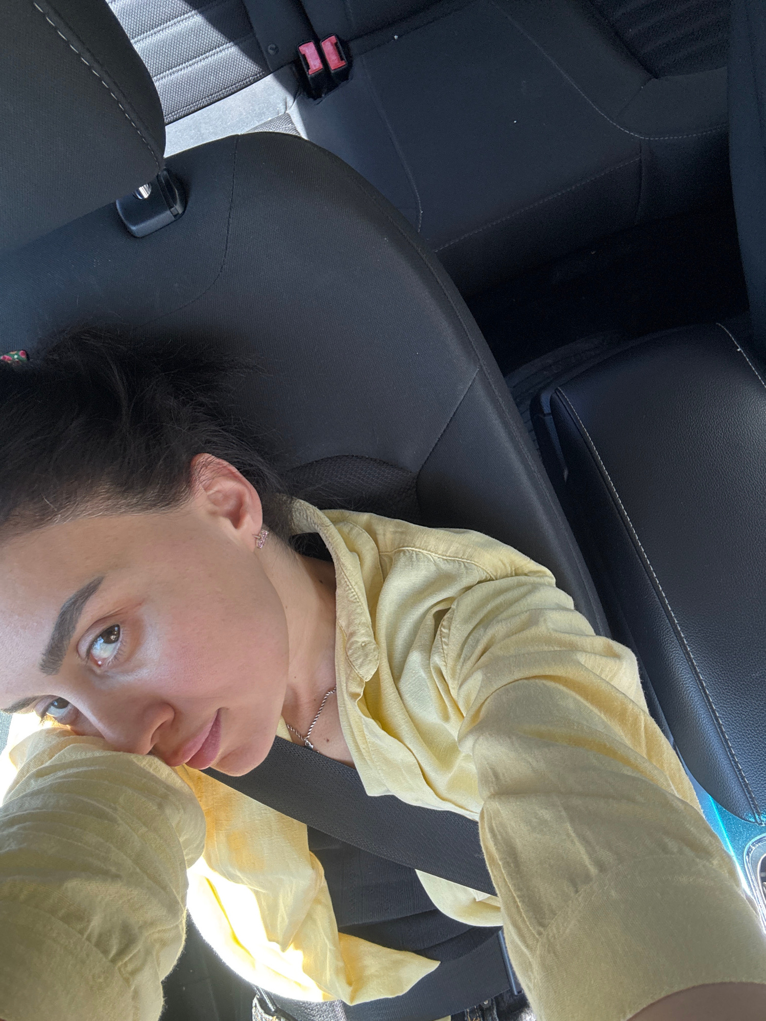 A woman with dark hair is seated in a car, wearing a pale yellow shirt and a seatbelt. The interior of the car is predominantly black. The location is difficult to ascertain based solely on the image;…read more