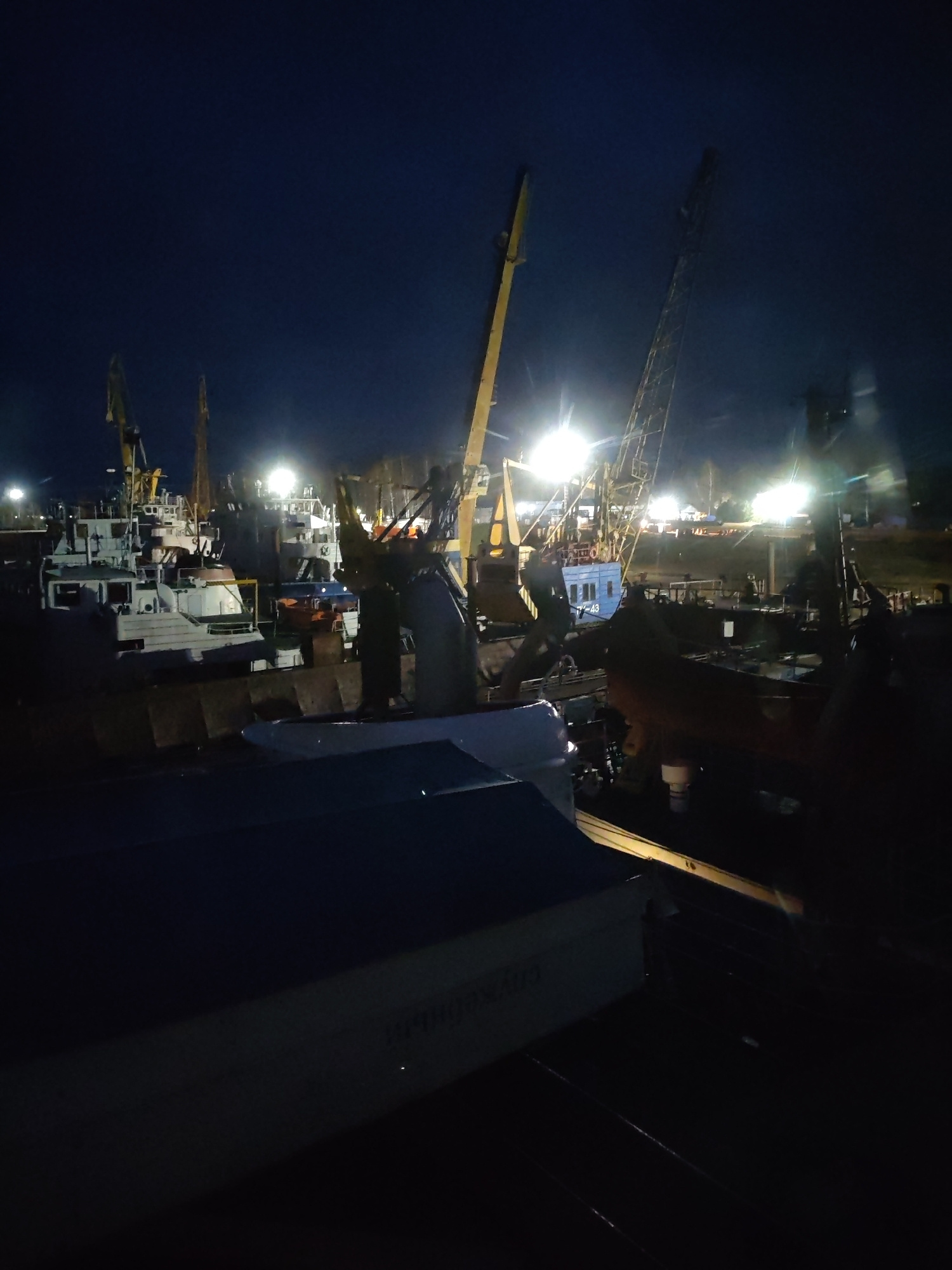 The photograph depicts a nighttime scene at a harbor or dock in Rybinsk, Russia. Several vessels are visible, some equipped with cranes. Artificial lights illuminate the area, creating bright spots ag…read more