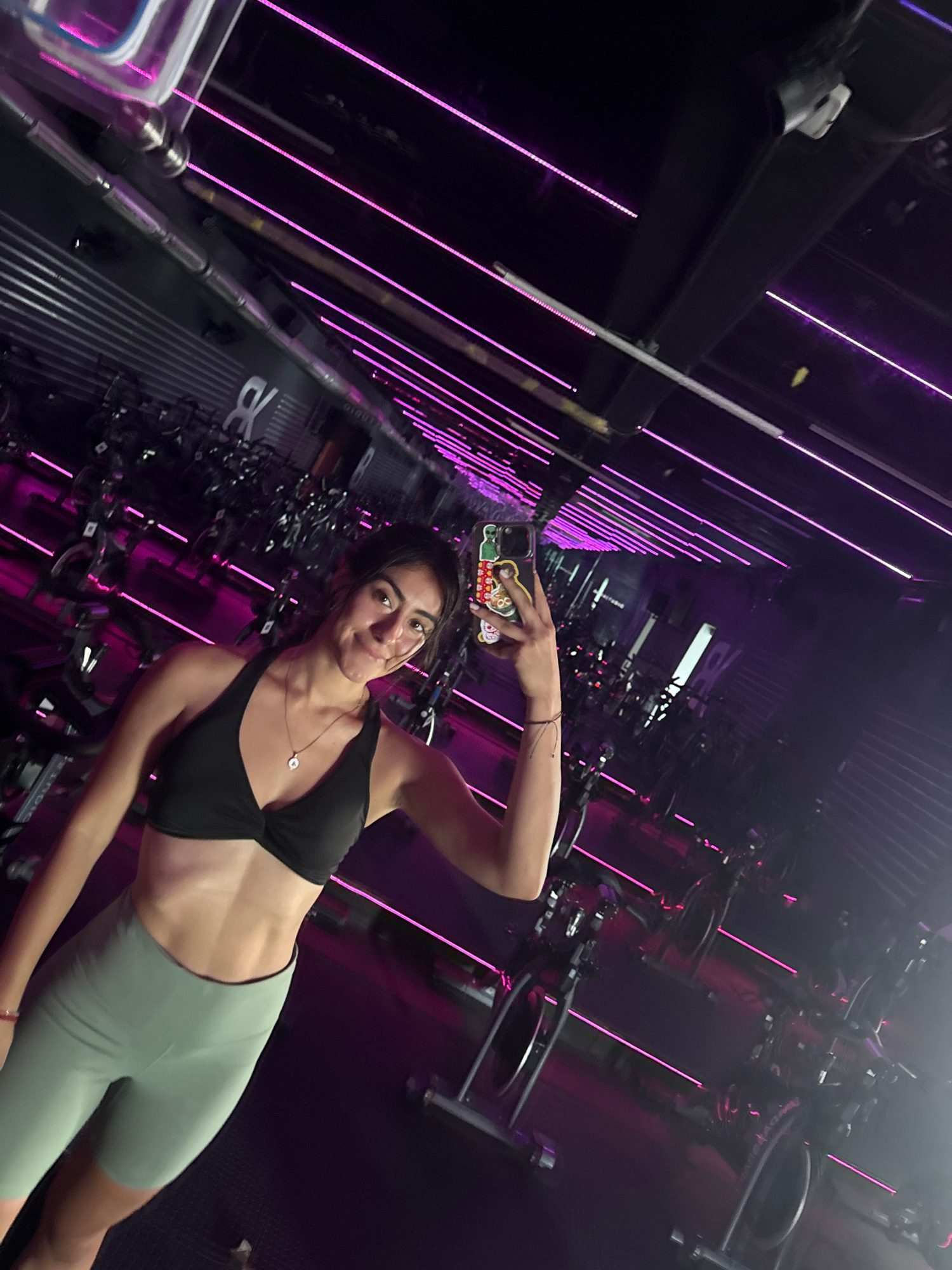 A low-angle shot shows a woman in a black sports bra and gray athletic shorts holding a phone in her right hand to take a picture of herself. She is in a workout studio with stationary bicycles and ro…read more