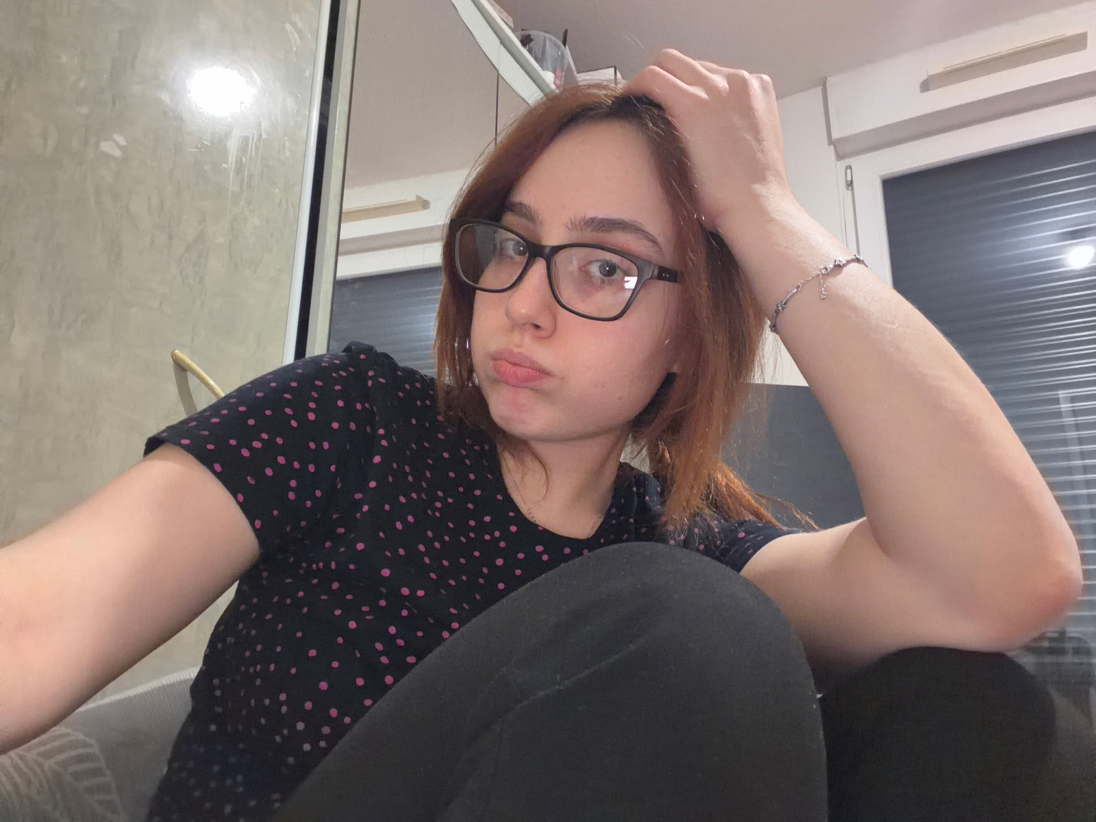 A woman with auburn hair and glasses is angled in the shot, wearing a black shirt with pink polka dots and black leggings. Her left hand, adorned with a bracelet, rests near her forehead. In the backg…read more