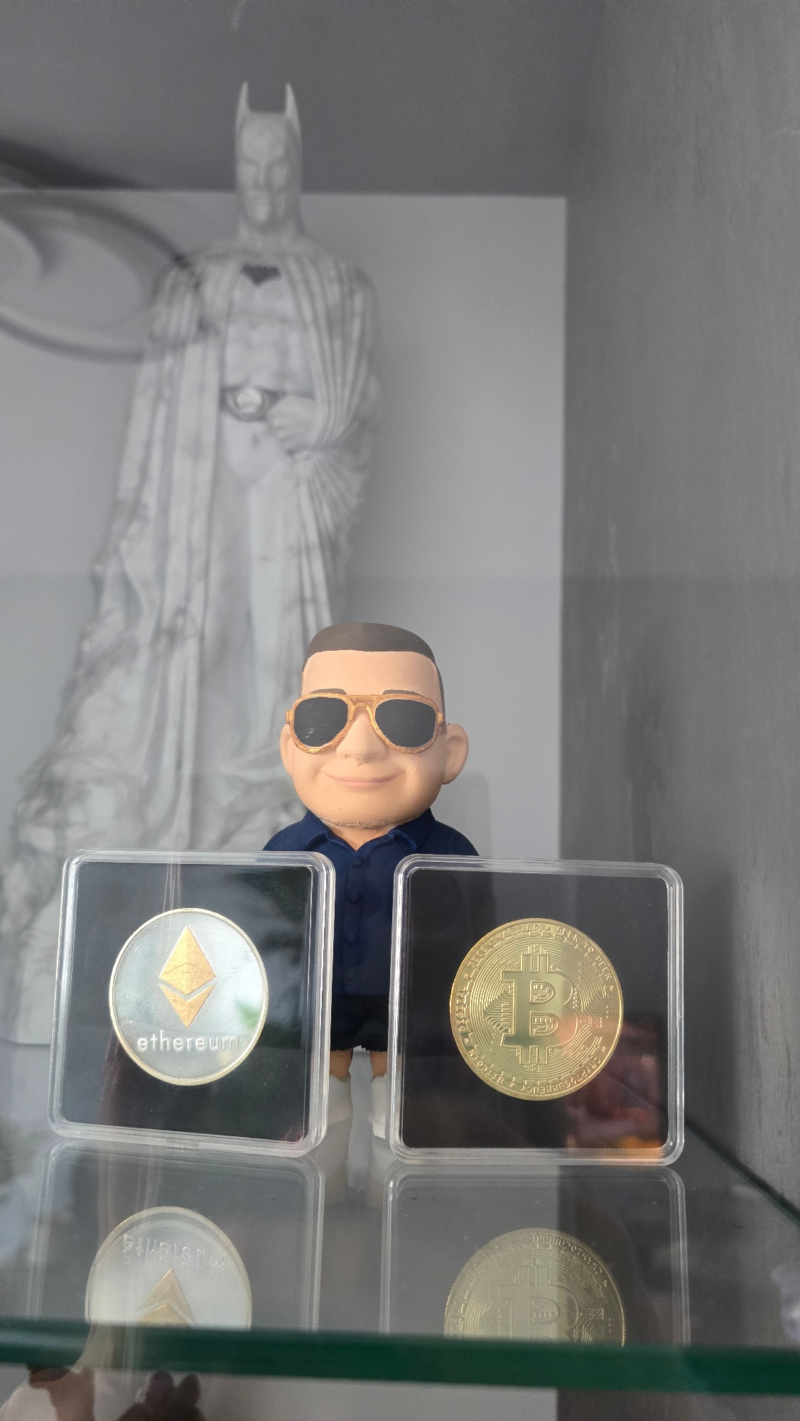 The image shows a display case containing cryptocurrency-themed items. In the upper left, a statue of Batman is visible. To the right, a bobblehead figure wearing sunglasses is positioned. Four encase…read more