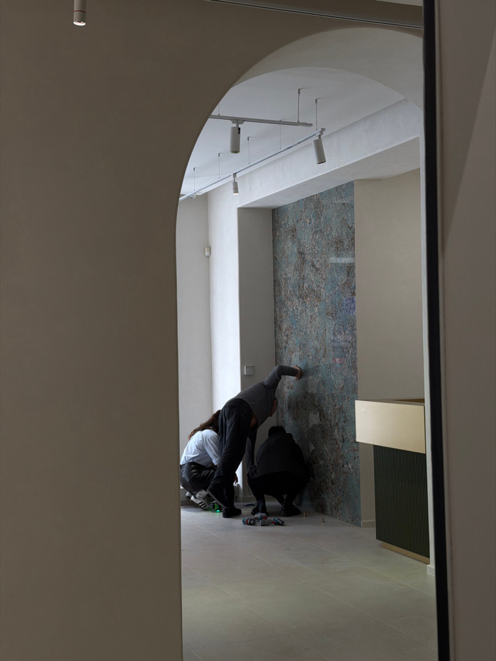 The image captures an interior space under construction or renovation, viewed through a light-colored arched doorway. The specific address within the city of Yerevan, Armenia, is not identifiable from…read more