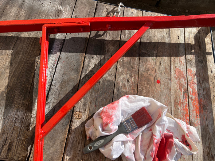 The scene, located in Wüstenrot, Germany, depicts a close-up, overhead view of painting activity. A metal structure, predominantly a frame with a diagonal support brace, has been freshly coated in glo…read more